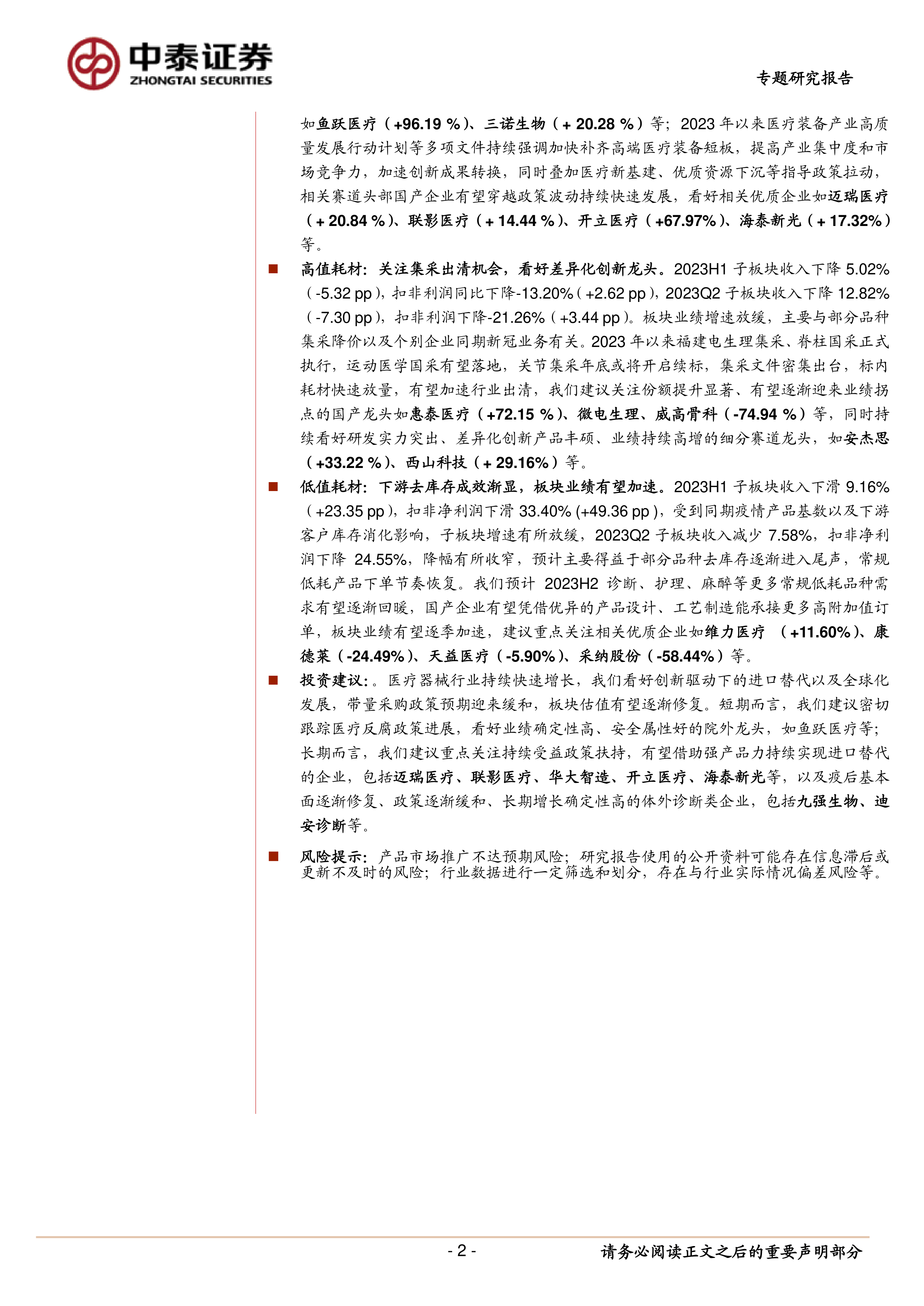 医疗设备:家用医疗表现亮眼,长期看好国产替代高端突破。2023H1子板块收入增长20.47%(+8.75pp),扣非利润同比增长23.81%(+13.40pp);2023Q2板块收入增速22.60%,扣非增长24.09%,得益于医疗新基建订单的持续释放以及部分应急设备的采购需求,设备板块持续取得优异成绩。新冠疫情后居民整体健康管理意识显著提升,有望加速家用医疗产品的普及渗透,同时板块兼具良好的政策安全性,建议关注相关企业如鱼跃医疗(+96.19%)、三诺生物(+20.28%)等;2023年以来医疗装备产业高质量发展行动计划等多项文件持续强调加快补齐高端医疗装备短板,提高产业集中度和市场竞争力,加速创新成果转换,同时叠加医疗新基建、优质资源下沉等指导政策拉动,相关赛道头部国产企业有望穿越政策波动持续快速发展,看好相关优质企业如迈瑞医疗(+20.84%)、联影医疗(+14.44%)、开立医疗(+67.97%)、海泰新光(+17.32%)等。高值耗材:关注集采出清机会,看好差异化创新龙头。2023H1子板块收入下降5.02%(-5.32pp),扣非利润同比下降-13.20%(+2.62pp),2023Q2子板块收入下降12.82%(-7.30pp),扣非利润下降-21.26%(+3.44pp)。板块业绩增速放缓,主要与部分品种集采降价以及个别企业同期新冠业务有关。2023年以来福建电生理集采、脊柱国采正式执行,运动医学国采有望落地,关节集采年底或将开启续标,集采文件密集出台,标内耗材快速放量,有望加速行业出清,我们建议关注份额提升显著、有望逐渐迎来业绩拐点的国产龙头如惠泰医疗(+72.15%)、微电生理、威高骨科(-74.94%)等,同时持续看好研发实力突出、差异化创新产品丰硕、业绩持续高增的细分赛道龙头,如安杰思(+33.22%)、西山科技(+29.16%)等。