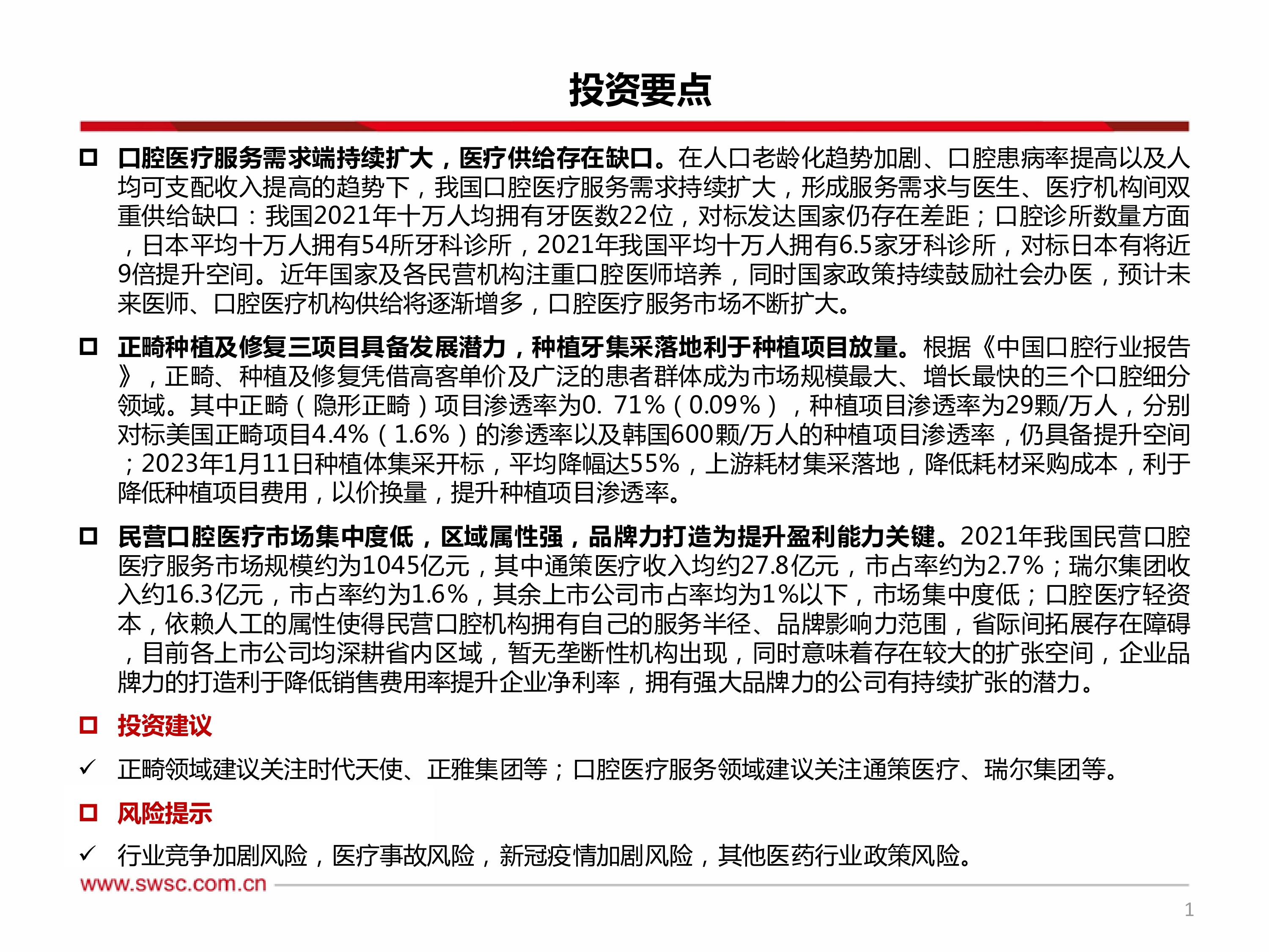 正畸领域建议关注时代天使、正雅集团等;口腔医疗服务领域建议关注通策医疗、瑞尔集团等。