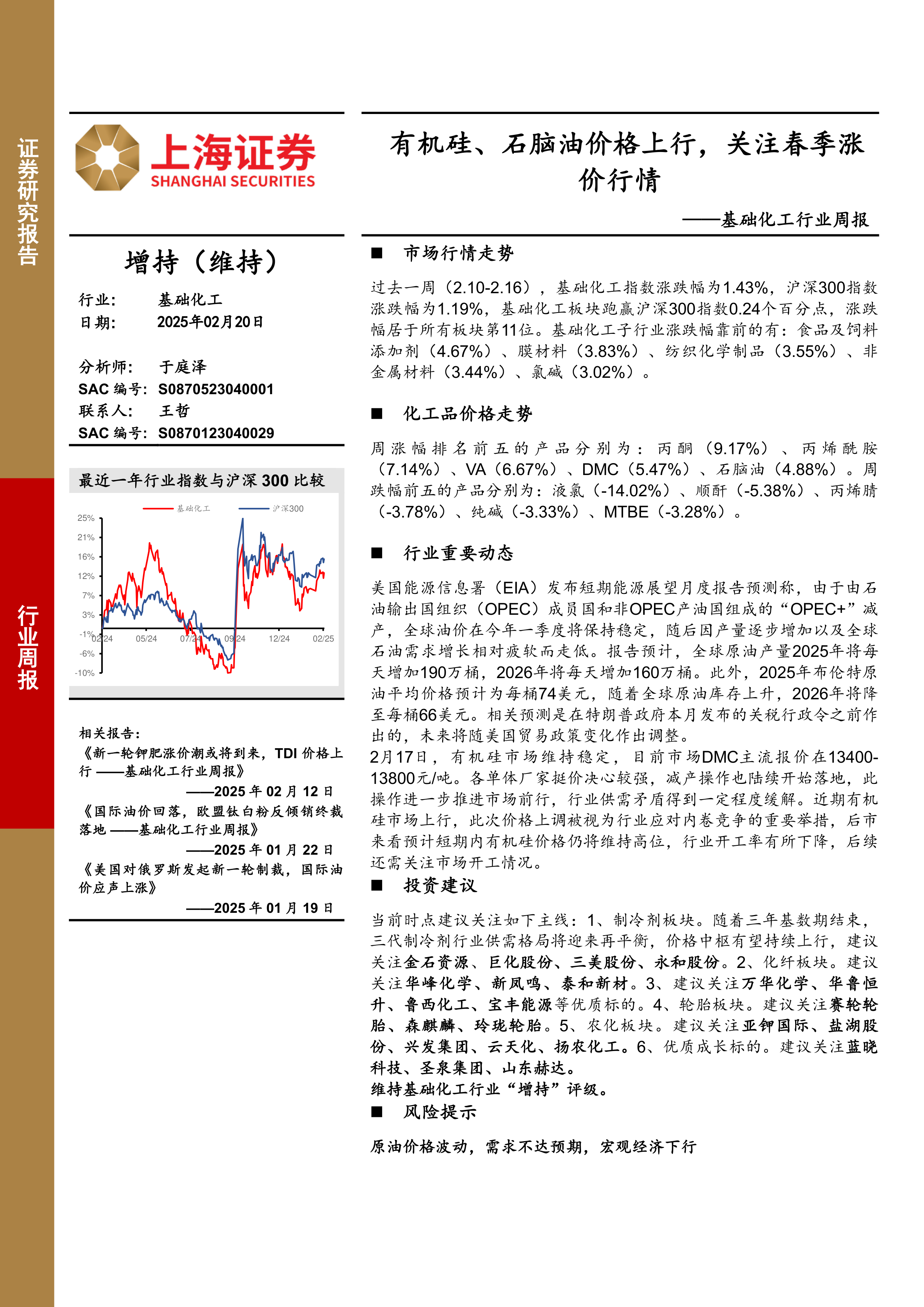 本周基础化工板块表现良好,部分化工品价格上涨,特别是与有机硅、石脑油相关的产品。报告建议关注制冷剂、化纤、轮胎、农化等板块,并维持行业“增持”评级。投资者应关注原油价格波动、需求变化及宏观经济下行等风险因素。