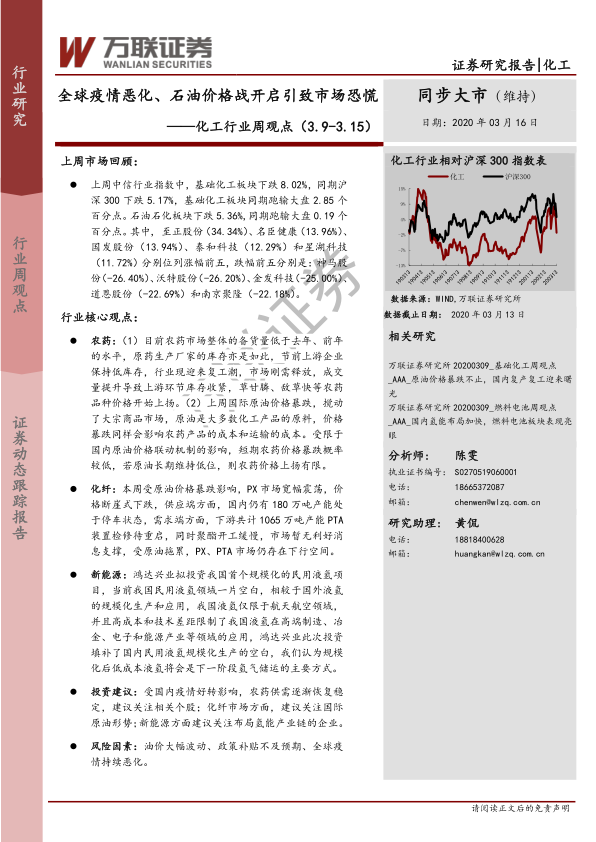 本报告分析了化工行业上周的市场表现,指出全球疫情恶化和石油价格战对市场造成冲击。报告重点关注了原油、化纤、农药、化肥等细分领域的价格走势和行业动态,并对未来投资提出建议,建议关注农药、化纤和氢能产业链相关企业,同时提示风险因素。
