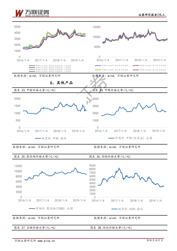 甲醛、甲醇、聚丙烯、丙酮、石蜡、丙烷、丙烯腈、丙烯酸、纯苯、醋酸、丁二烯、醋酸酐、己内酰胺、甘油、辛醇、无水乙醇、乙二醇、正丁醇、异丙醇、DMF、DOP、丙烯酸甲酯、甲基丙烯酸、正己烷、碳酸锂和DMC等产品价格走势各异。