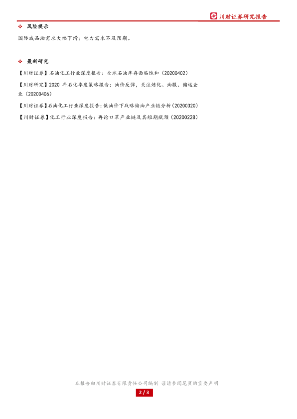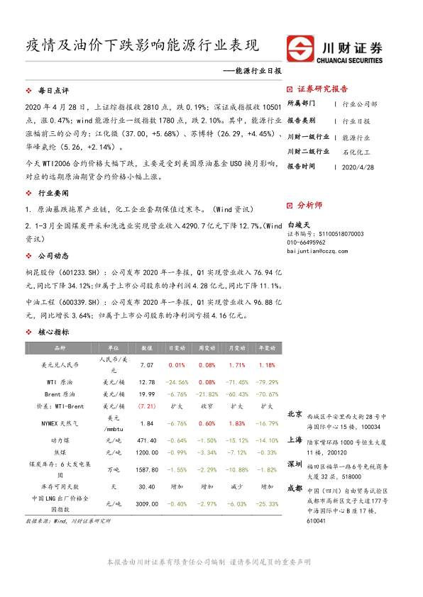 本报告分析了2020年4月28日能源行业的市场表现,指出疫情和油价下跌是导致行业整体表现疲软的主要原因。WTI原油价格的暴跌对产业链造成冲击,化工企业面临挑战。尽管行业整体下行,但部分公司仍有上涨,表明行业内部存在结构性机会。报告还提示了国际成品油需求下滑和电力需求不及预期的风险,并提供了相关的研究报告作为参考。