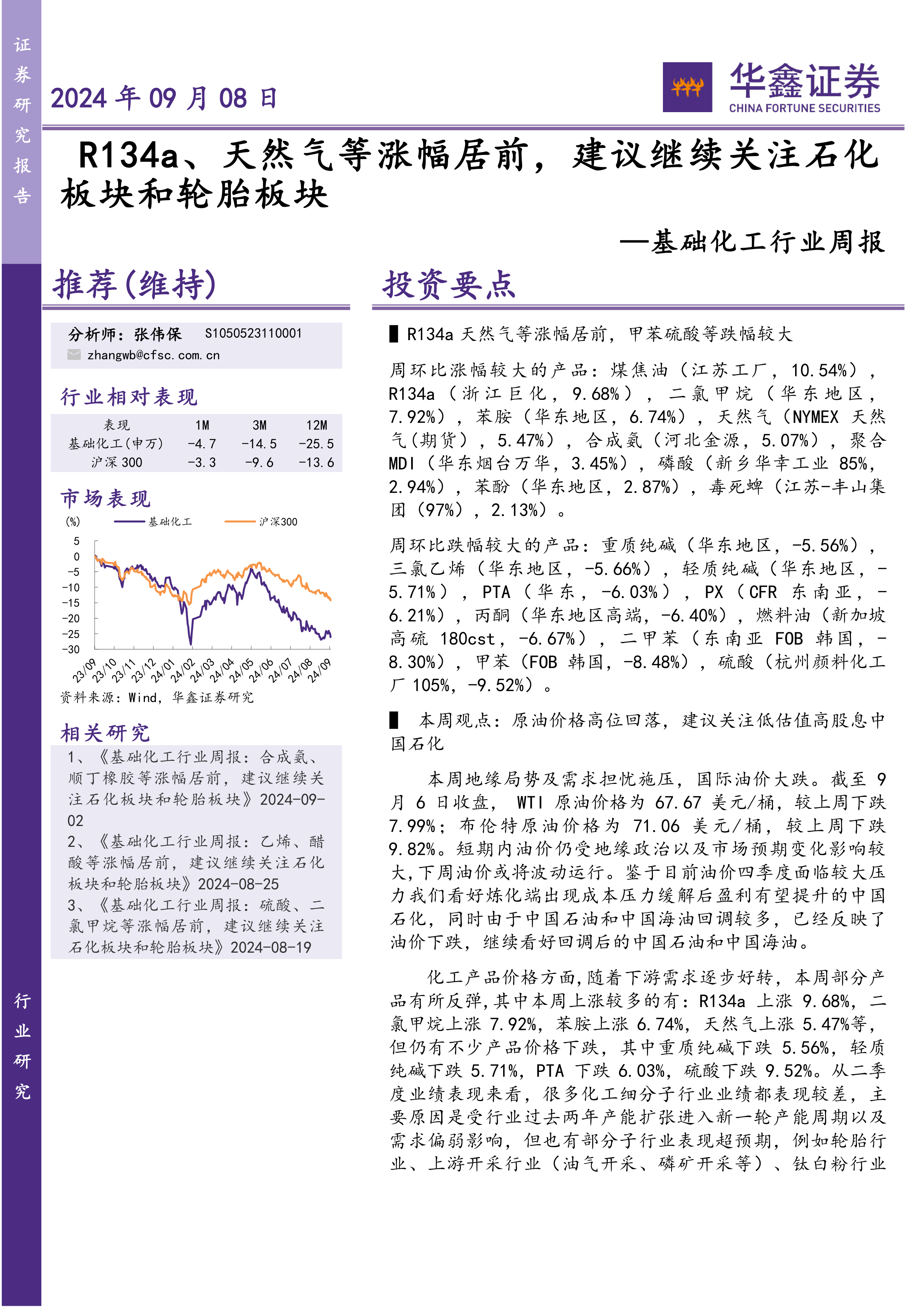 基础化工行业周报:R134a、天然气等涨幅居前,建议继续关注石化板块和轮胎板块