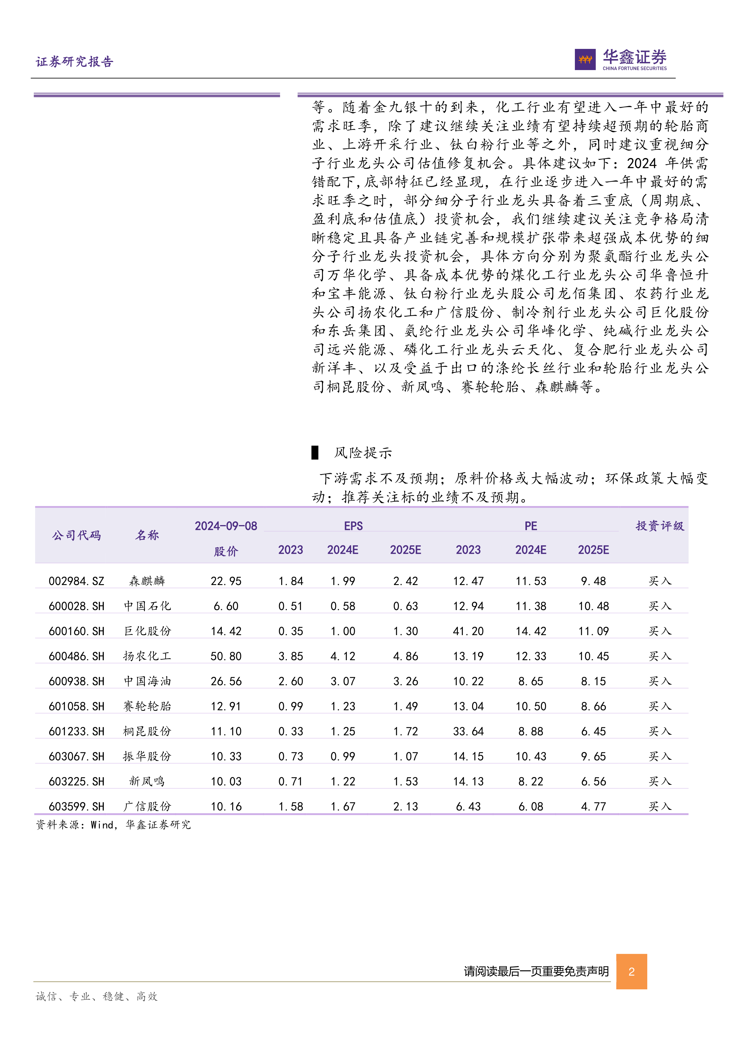 化工产品价格方面,随着下游需求逐步好转,本周部分产品有所反弹,其中本周上涨较多的有:R134a上涨9.68%,二氯甲烷上涨7.92%,苯胺上涨6.74%,天然气上涨5.47%等,但仍有不少产品价格下跌,其中重质纯碱下跌5.56%,轻质纯碱下跌5.71%,PTA下跌6.03%,硫酸下跌9.52%。从二季度业绩表现来看,很多化工细分子行业业绩都表现较差,主要原因是受行业过去两年产能扩张进入新一轮产能周期以及需求偏弱影响,但也有部分子行业表现超预期,例如轮胎行业、上游开采行业(油气开采、磷矿开采等)、钛白粉行业等。随着金九银十的到来,化工行业有望进入一年中最好的需求旺季,除了建议继续关注业绩有望持续超预期的轮胎商业、上游开采行业、钛白粉行业等之外,同时建议重视细分子行业龙头公司估值修复机会。具体建议如下:2024年供需错配下,底部特征已经显现,在行业逐步进入一年中最好的需求旺季之时,部分细分子行业龙头具备着三重底(周期底、盈利底和估值底)投资机会,我们继续建议关注竞争格局清晰稳定且具备产业链完善和规模扩张带来超强成本优势的细分子行业龙头投资机会,具体方向分别为聚氨酯行业龙头公司万华化学、具备成本优势的煤化工行业龙头公司华鲁恒升和宝丰能源、钛白粉行业龙头股公司龙佰集团、农药行业龙头公司扬农化工和广信股份、制冷剂行业龙头公司巨化股份和东岳集团、氨纶行业龙头公司华峰化学、纯碱行业龙头公司远兴能源、磷化工行业龙头云天化、复合肥行业龙头公司新洋丰、以及受益于出口的涤纶长丝行业和轮胎行业龙头公司桐昆股份、新凤鸣、赛轮轮胎、森麒麟等。