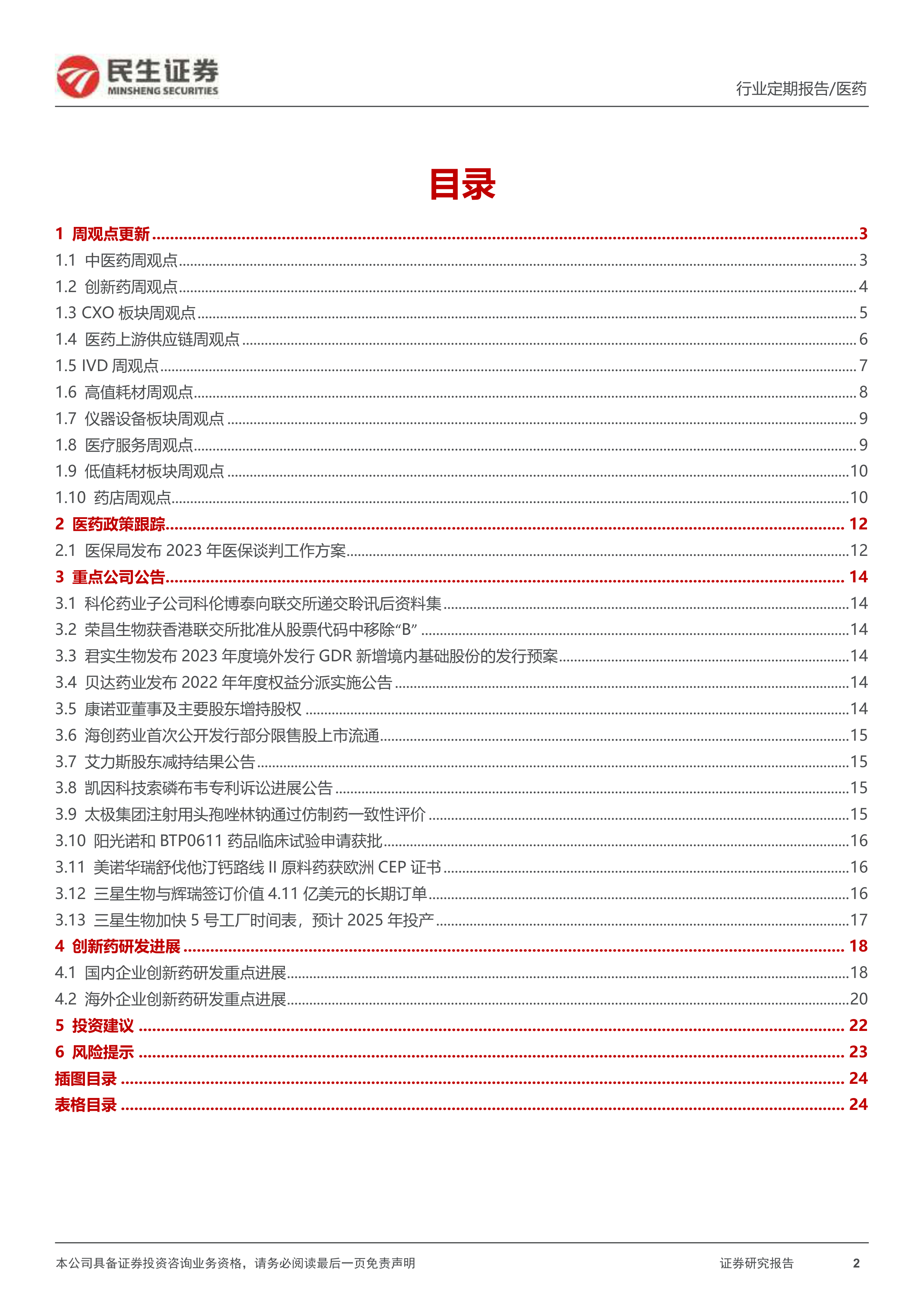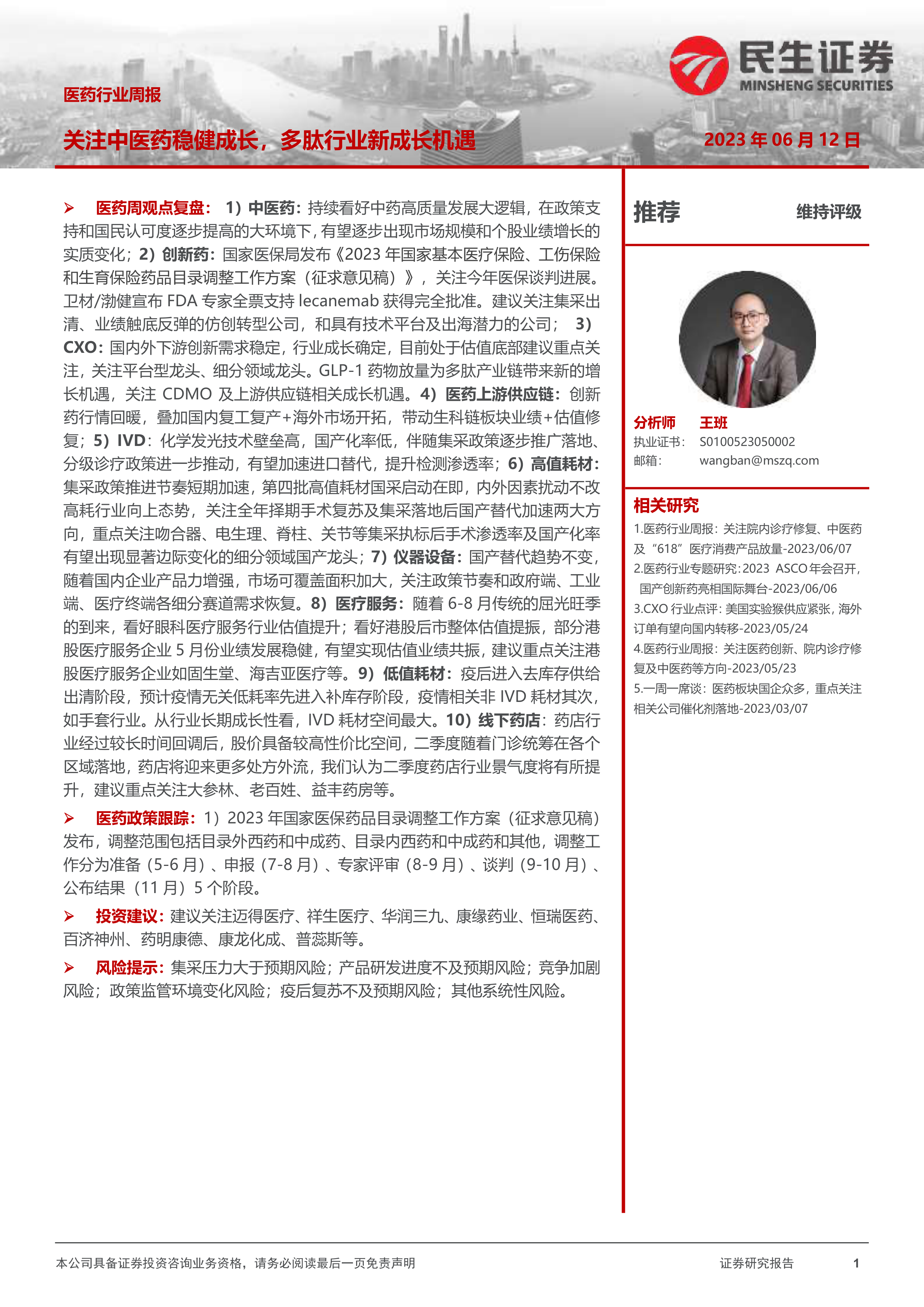 医药周观点复盘:1)中医药:持续看好中药高质量发展大逻辑,在政策支持和国民认可度逐步提高的大环境下,有望逐步出现市场规模和个股业绩增长的实质变化;2)创新药:国家医保局发布《2023年国家基本医疗保险、工伤保险和生育保险药品目录调整工作方案(征求意见稿)》,关注今年医保谈判进展。卫材/渤健宣布FDA专家全票支持lecanemab获得完全批准。建议关注集采出清、业绩触底反弹的仿创转型公司,和具有技术平台及出海潜力的公司;3)CXO:国内外下游创新需求稳定,行业成长确定,目前处于估值底部建议重点关注,关注平台型龙头、细分领域龙头。GLP-1药物放量为多肽产业链带来新的增长机遇,关注CDMO及上游供应链相关成长机遇。4)医药上游供应链:创新药行情回暖,叠加国内复工复产+海外市场开拓,带动生科链板块业绩+估值修复;5)IVD:化学发光技术壁垒高,国产化率低,伴随集采政策逐步推广落地、分级诊疗政策进一步推动,有望加速进口替代,提升检测渗透率;6)高值耗材:集采政策推进节奏短期加速,第四批高值耗材国采启动在即,内外因素扰动不改高耗行业向上态势,关注全年择期手术复苏及集采落地后国产替代加速两大方向,重点关注吻合器、电生理、脊柱、关节等集采执标后手术渗透率及国产化率有望出现显著边际变化的细分领域国产龙头;7)仪器设备:国产替代趋势不变,随着国内企业产品力增强,市场可覆盖面积加大,关注政策节奏和政府端、工业端、医疗终端各细分赛道需求恢复。8)医疗服务:随着6-8月传统的屈光旺季的到来,看好眼科医疗服务行业估值提升;看好港股后市整体估值提振,部分港股医疗服务企业5月份业绩发展稳健,有望实现估值业绩共振,建议重点关注港股医疗服务企业如固生堂、海吉亚医疗等。9)低值耗材:疫后进入去库存供给出清阶段,预计疫情无关低耗率先进入补库存阶段,疫情相关非IVD耗材其次,如手套行业。从行业长期成长性看,IVD耗材空间最大。10)线下药店:药店行业经过较长时间回调后,股价具备较高性价比空间,二季度随着门诊统筹在各个区域落地,药店将迎来更多处方外流,我们认为二季度药店行业景气度将有所提升,建议重点关注大参林、老百姓、益丰药房等。