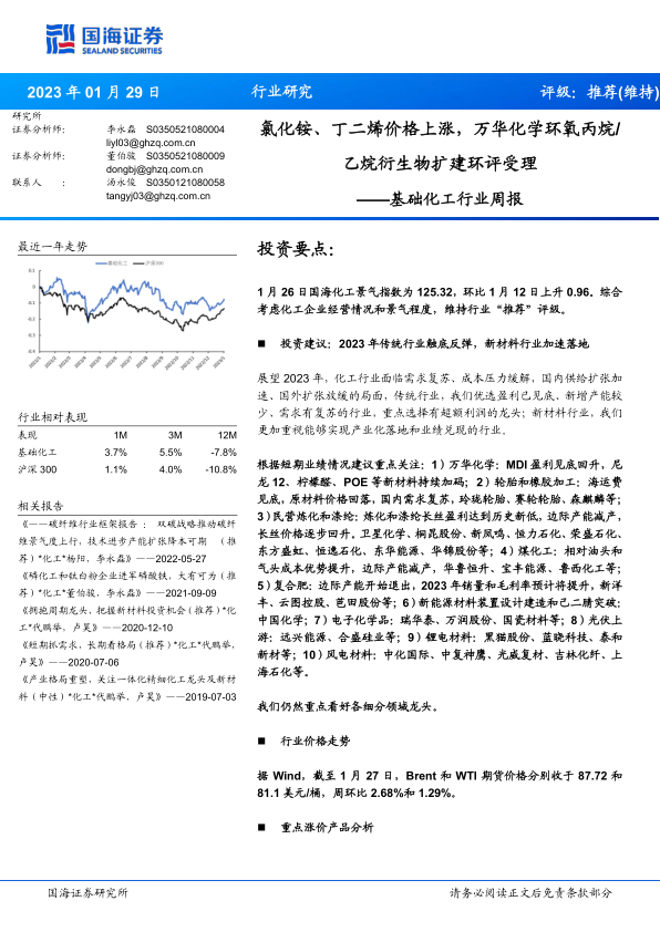 根据短期业绩情况建议重点关注:1)万华化学:MDI盈利见底回升,尼龙12、柠檬醛、POE等新材料持续加码;2)轮胎和橡胶加工:海运费见底,原材料价格回落,国内需求复苏,玲珑轮胎、赛轮轮胎、森麒麟等;3)民营炼化和涤纶:炼化和涤纶长丝盈利达到历史新低,边际产能减产,长丝价格逐步回升。卫星化学、桐昆股份、新凤鸣、恒力石化、荣盛石化、东方盛虹、恒逸石化、东华能源、华锦股份等;4)煤化工:相对油头和气头成本优势提升,边际产能减产,华鲁恒升、宝丰能源、鲁西化工等;5)复合肥:边际产能开始退出,2023年销量和毛利率预计将提升,新洋丰、云图控股、芭田股份等;6)新能源材料装置设计建造和己二腈突破:中国化学;7)电子化学品:瑞华泰、万润股份、国瓷材料等;8)光伏上游:远兴能源、合盛硅业等;9)锂电材料:黑猫股份、蓝晓科技、泰和新材等;10)风电材料:中化国际、中复神鹰、光威复材、吉林化纤、上海石化等。