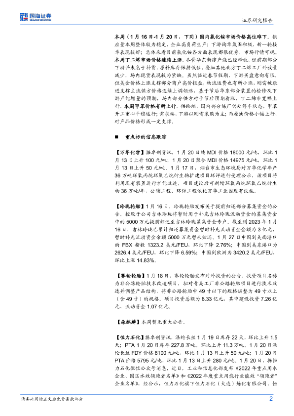 【齐翔腾达】据Wind,2023年1月18日顺酐价格为7100元/吨,环比上升420元/吨;据卓创资讯,1月20日,丁酮价格7933.33元/吨,环比不变。