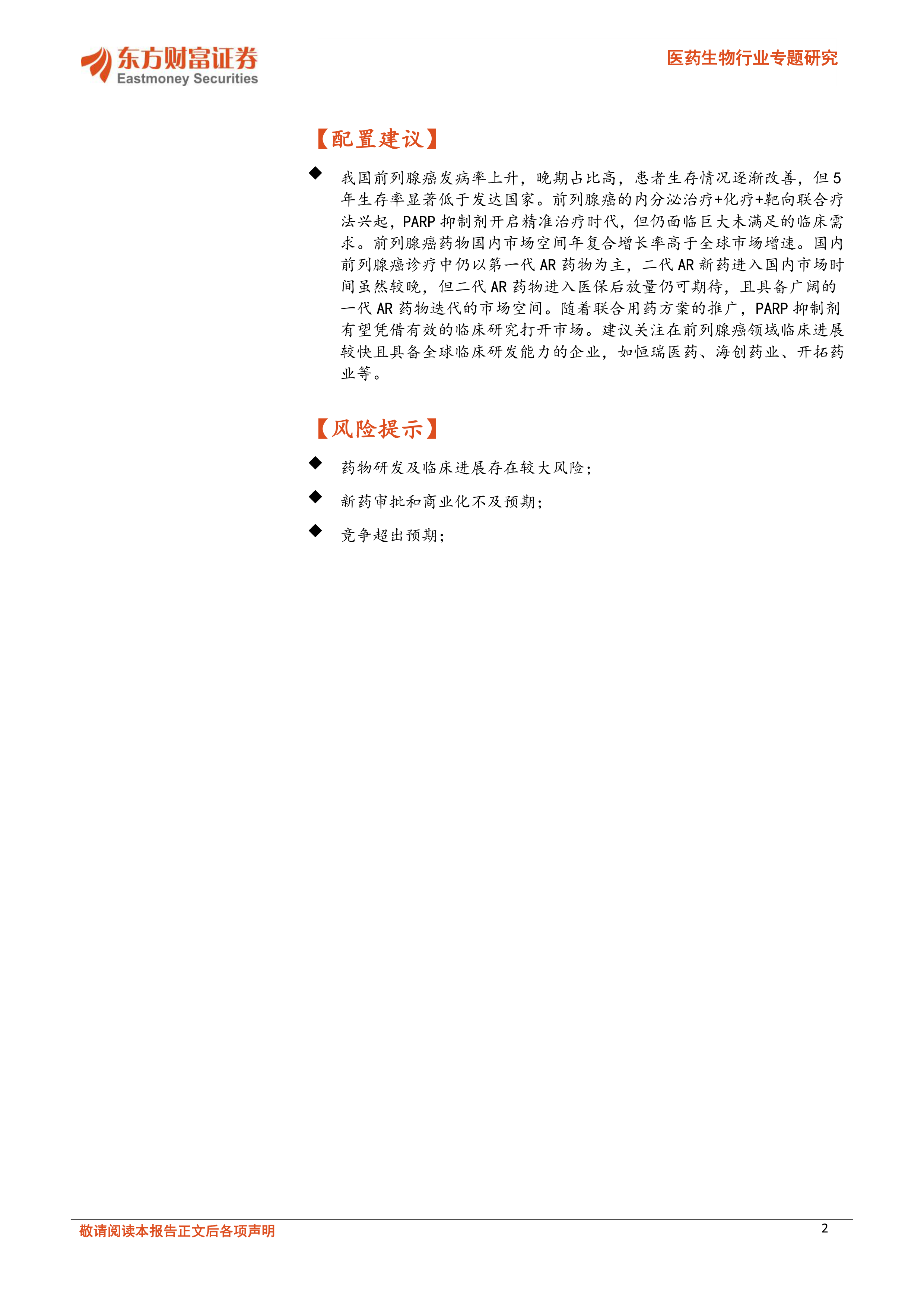 我国前列腺癌发病率上升,晚期占比高,患者生存情况逐渐改善,但5年生存率显著低于发达国家。前列腺癌的内分泌治疗+化疗+靶向联合疗法兴起,PARP抑制剂开启精准治疗时代,但仍面临巨大未满足的临床需求。前列腺癌药物国内市场空间年复合增长率高于全球市场增速。国内前列腺癌诊疗中仍以第一代AR药物为主,二代AR新药进入国内市场时间虽然较晚,但二代AR药物进入医保后放量仍可期待,且具备广阔的一代AR药物迭代的市场空间。随着联合用药方案的推广,PARP抑制剂有望凭借有效的临床研究打开市场。建议关注在前列腺癌领域临床进展较快且具备全球临床研发能力的企业,如恒瑞医药、海创药业、开拓药业等。