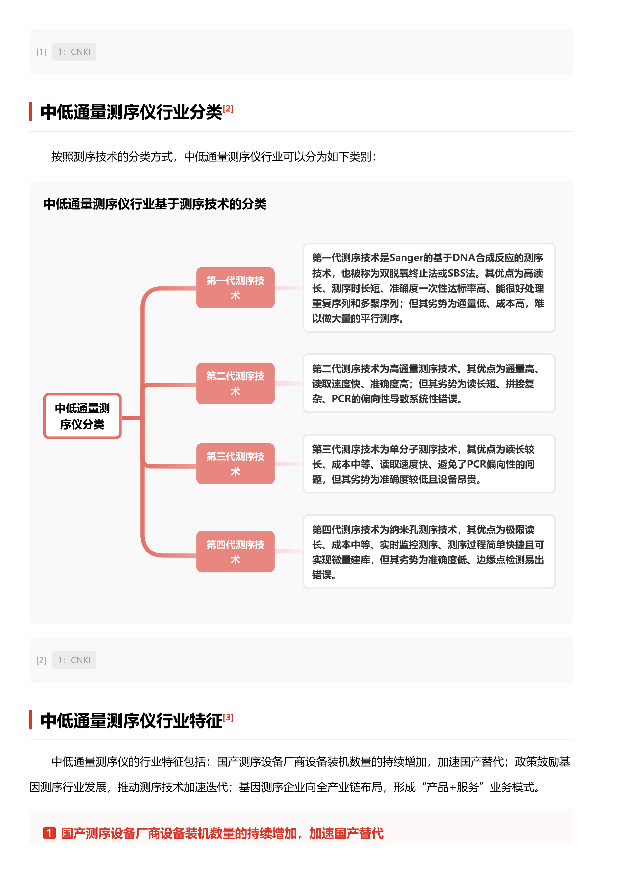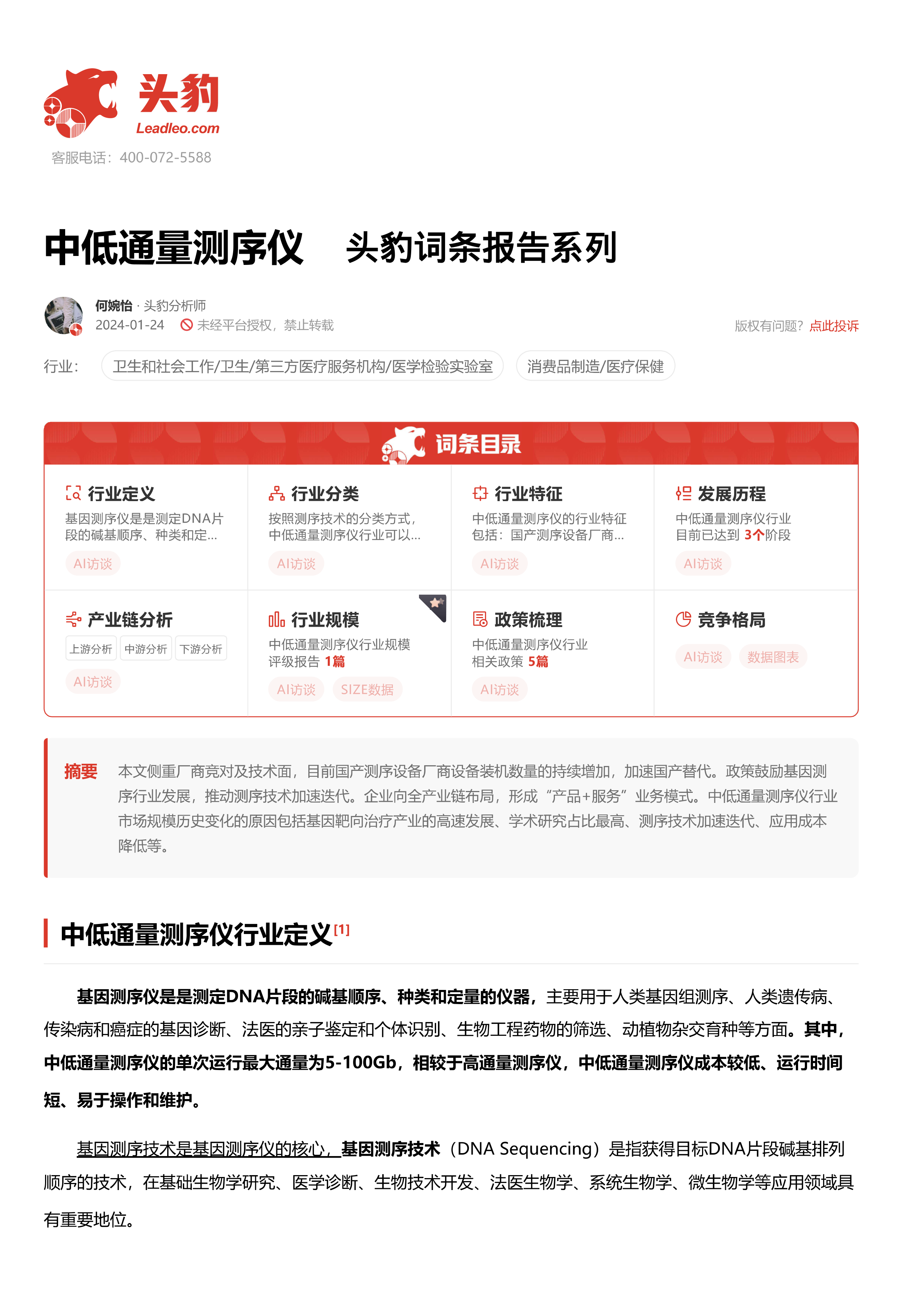摘要 本文侧重厂商竞对及技术面,目前国产测序设备厂商设备装机数量的持续增加,加速国产替代。政策鼓励基因测序行业发展,推动测序技术加速选代。企业向全产业链布局,形成“产品+服务”业务模式。中低通量测序仪行业市场规模历史变化的原因包括基因轮向治疗产业的高速发展、学术研究占比最高、测序技术加速选代、应用成本降低等。