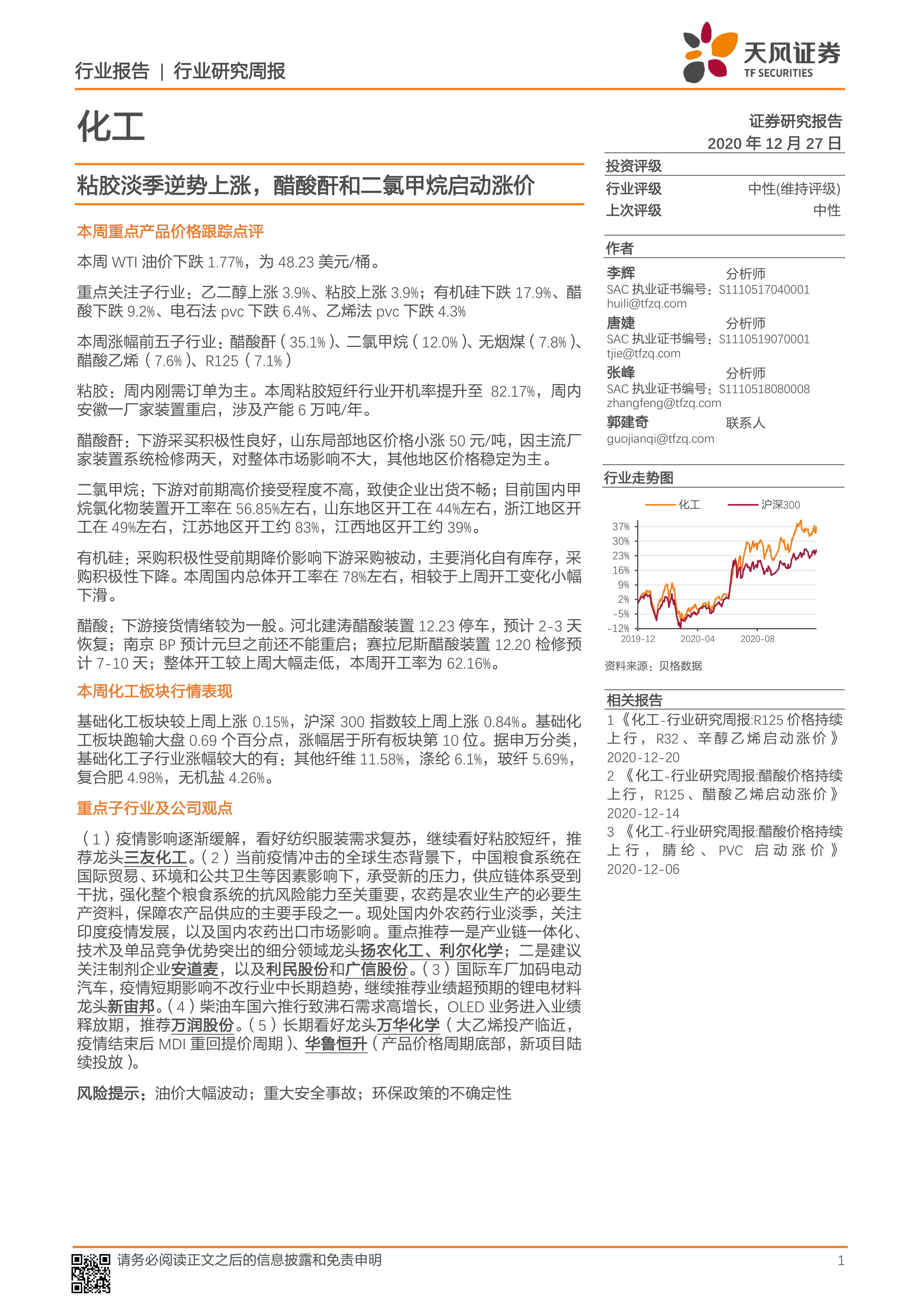 本周化工行业整体表现弱于大盘,但部分子行业和产品表现出积极信号。报告重点关注了乙二醇、粘胶短纤等产品价格上涨,以及醋酸酐、二氯甲烷等产品启动涨价。报告分析了各子行业的市场表现、重点产品的价格变动,并提供了对重点个股的最新观点和投资建议。 建议投资者关注纺织服装、农药、锂电材料、OLED等领域,并关注万华化学、华鲁恒升等龙头企业。 投资者应关注油价波动、安全事故和环保政策等风险因素。