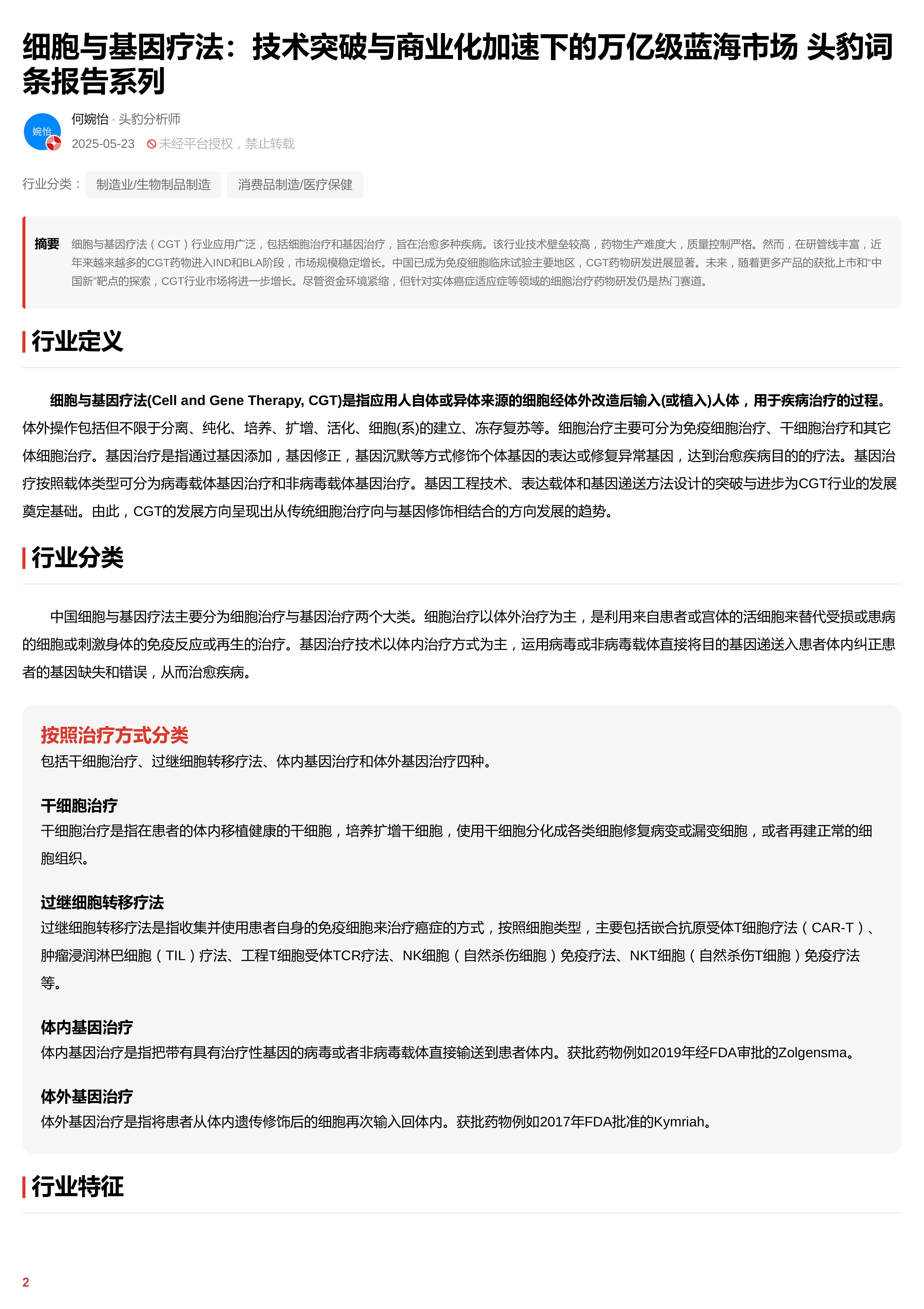 细胞与基因疗法:技术突破与商业化加速下的万亿级蓝海市场 头豹词条报告系列