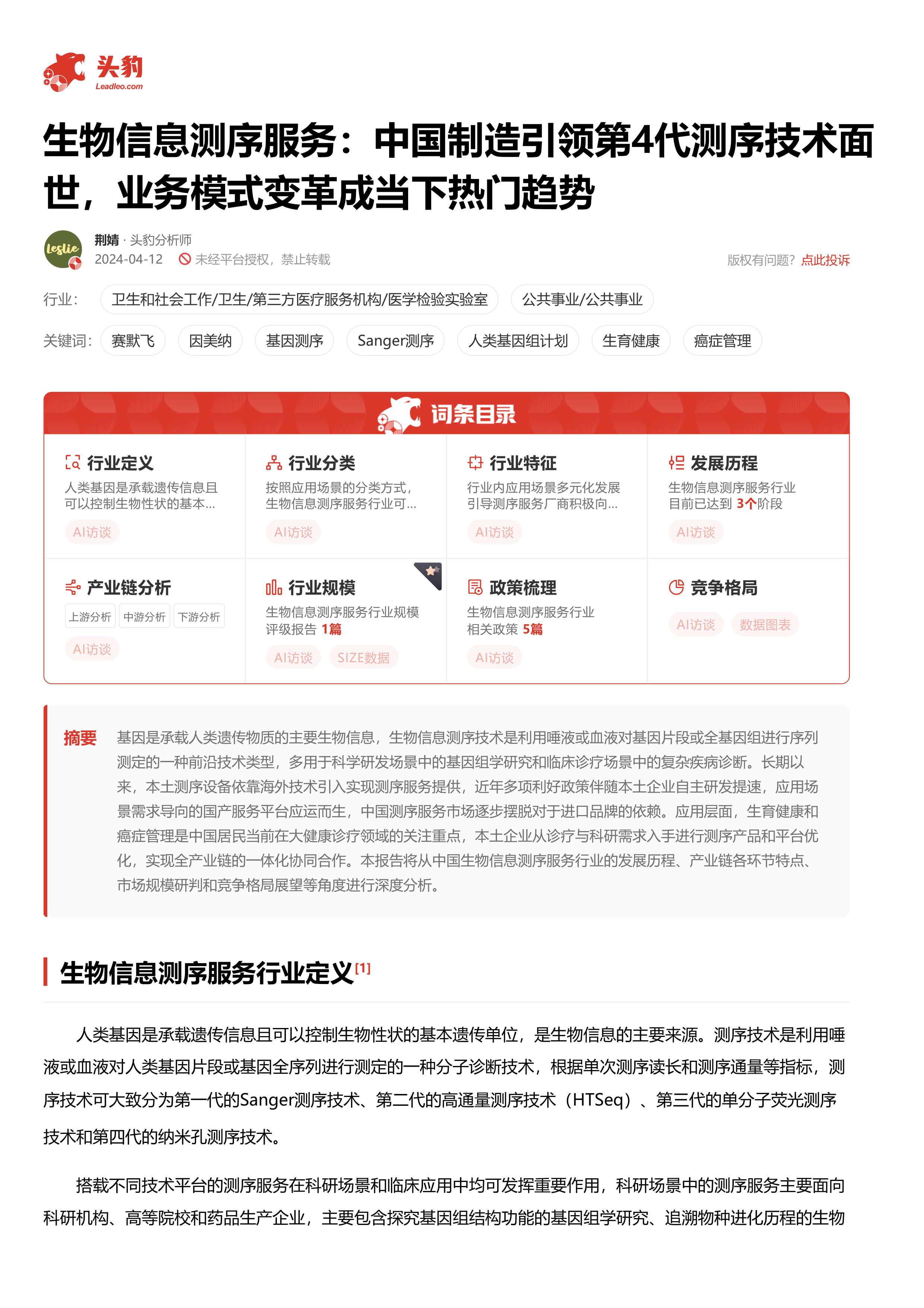本报告深入分析了中国生物信息测序服务行业的现状、发展趋势、市场规模、政策环境和竞争格局。 行业正处于快速发展期,国产企业崛起,技术创新和应用场景拓展是主要驱动力。 市场规模持续扩大,但面临技术、人才、资金和隐私等挑战。 头部企业通过技术创新和产业链整合巩固市场地位。 政策支持和居民健康意识提升将持续推动行业发展。