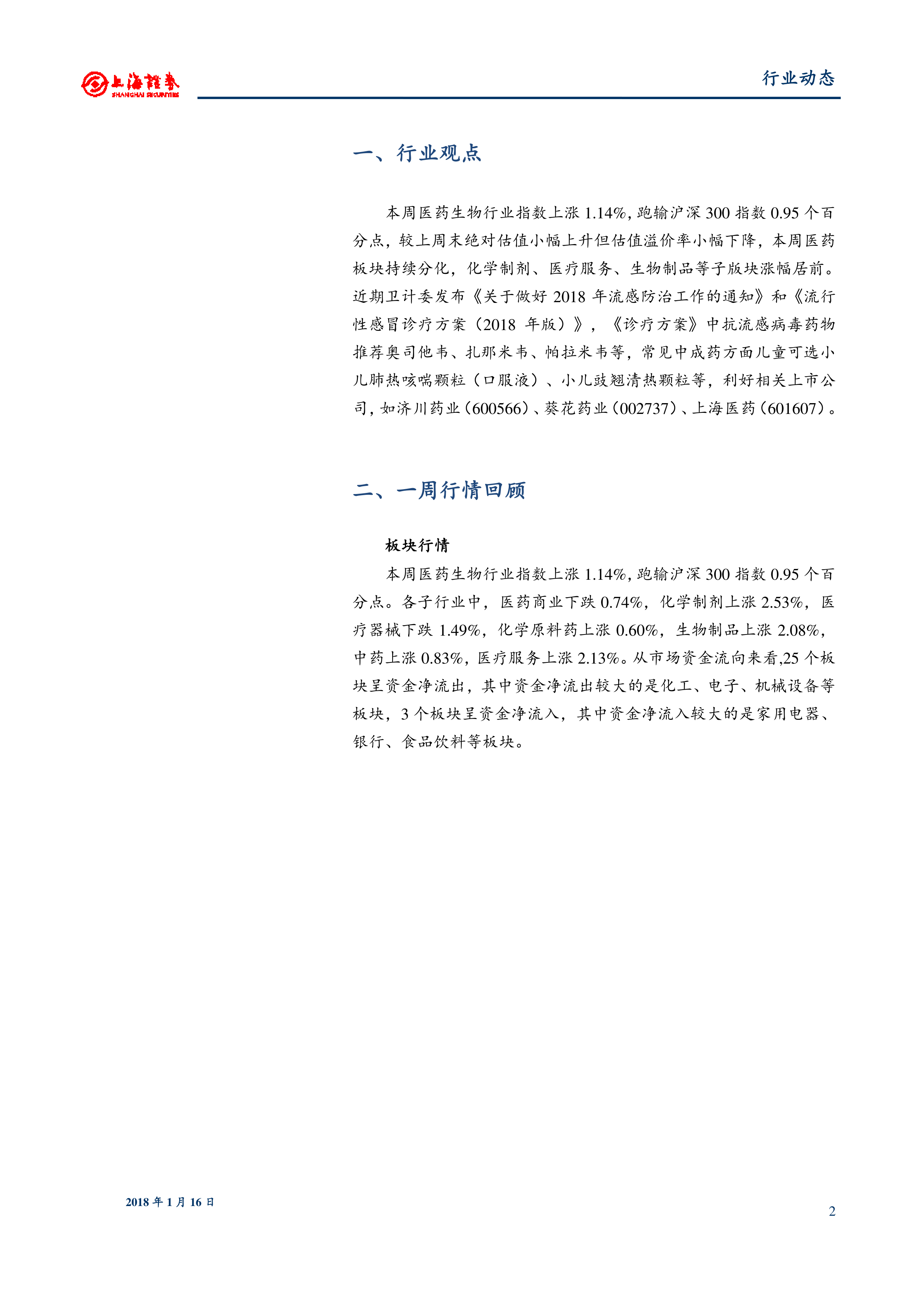 本报告分析了2018年1月8日至12日期间医药生物行业的市场表现,指出行业整体表现跑输大盘,但部分子行业表现较好。报告总结了行业新闻和上市公司公告,并对行业维持“增持”评级,建议关注细分板块龙头、创新药及优质仿制药龙头以及受益于“两票制”的医药商业公司。