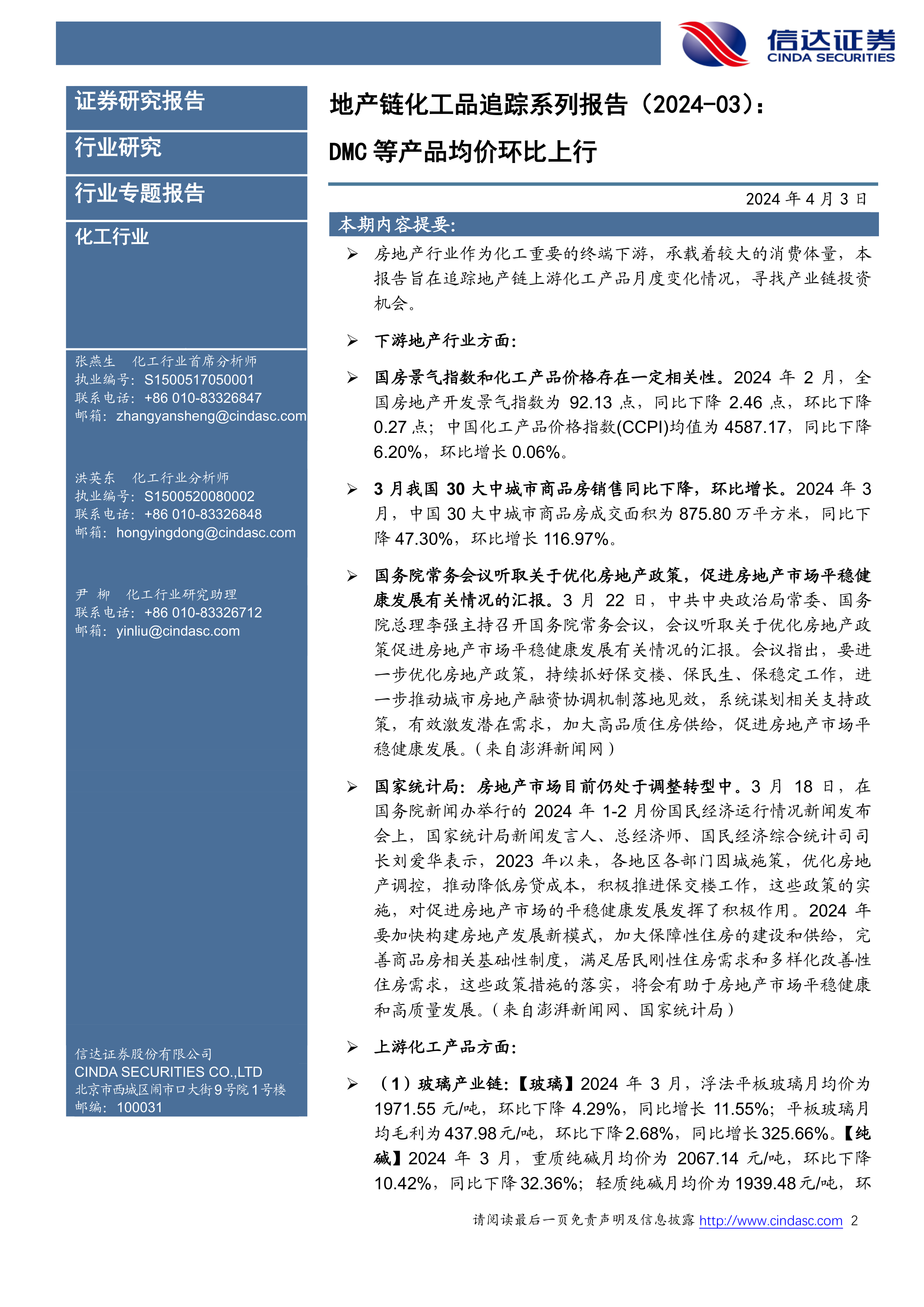 地产链化工品追踪系列报告(2024-03):DMC等产品均价环比上行
