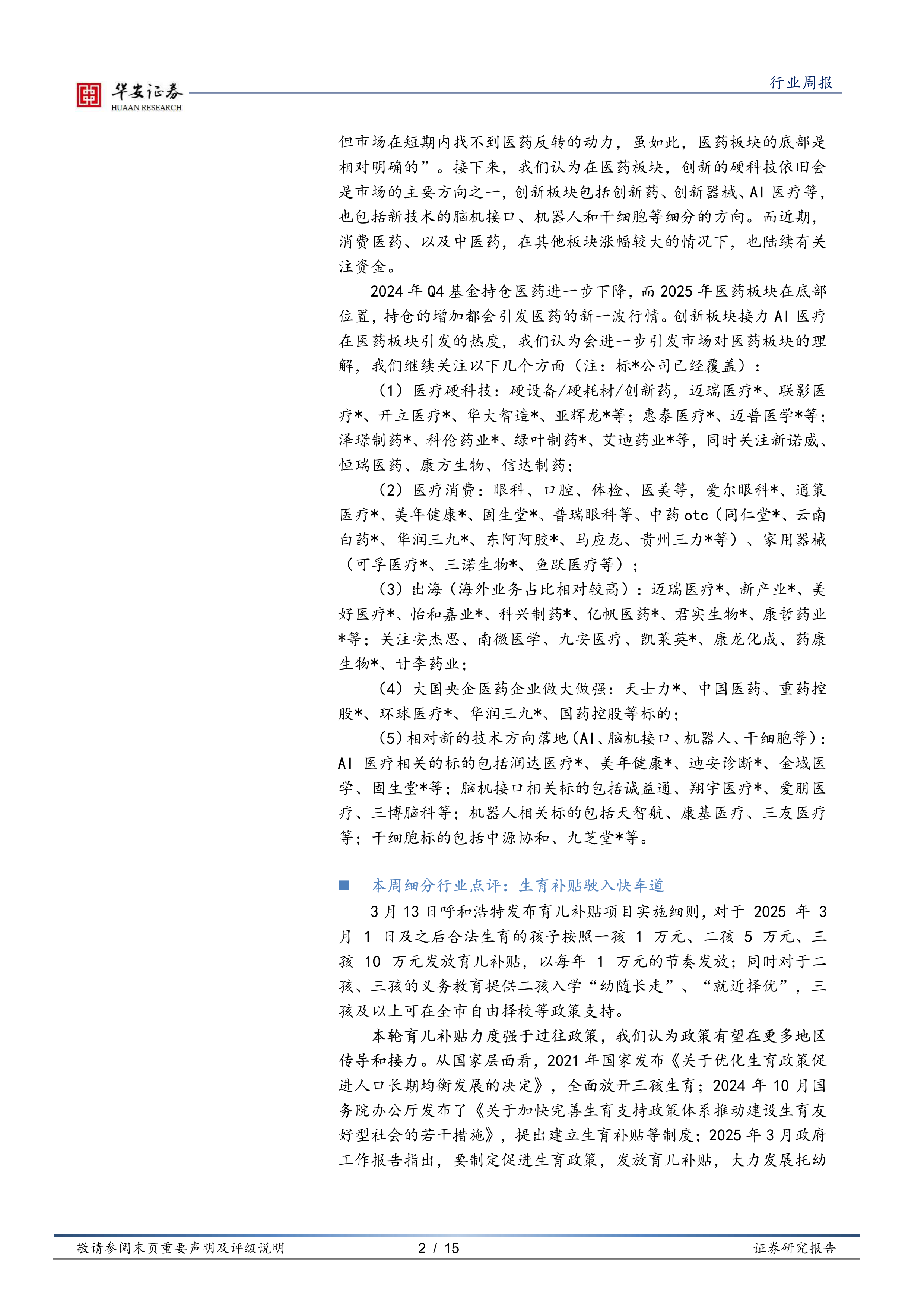 本周医药生物板块在辅助生殖政策的推动下表现活跃,市场对创新药、AI医疗等硬科技领域保持关注。呼和浩特育儿补贴政策的落地,有望推动生育产业链发展。 建议投资者关注医疗硬科技、医疗消费、出海业务、大国央企医药企业以及新技术落地等领域,并密切关注辅助生殖、生殖相关药品等生育产业链相关标的。
