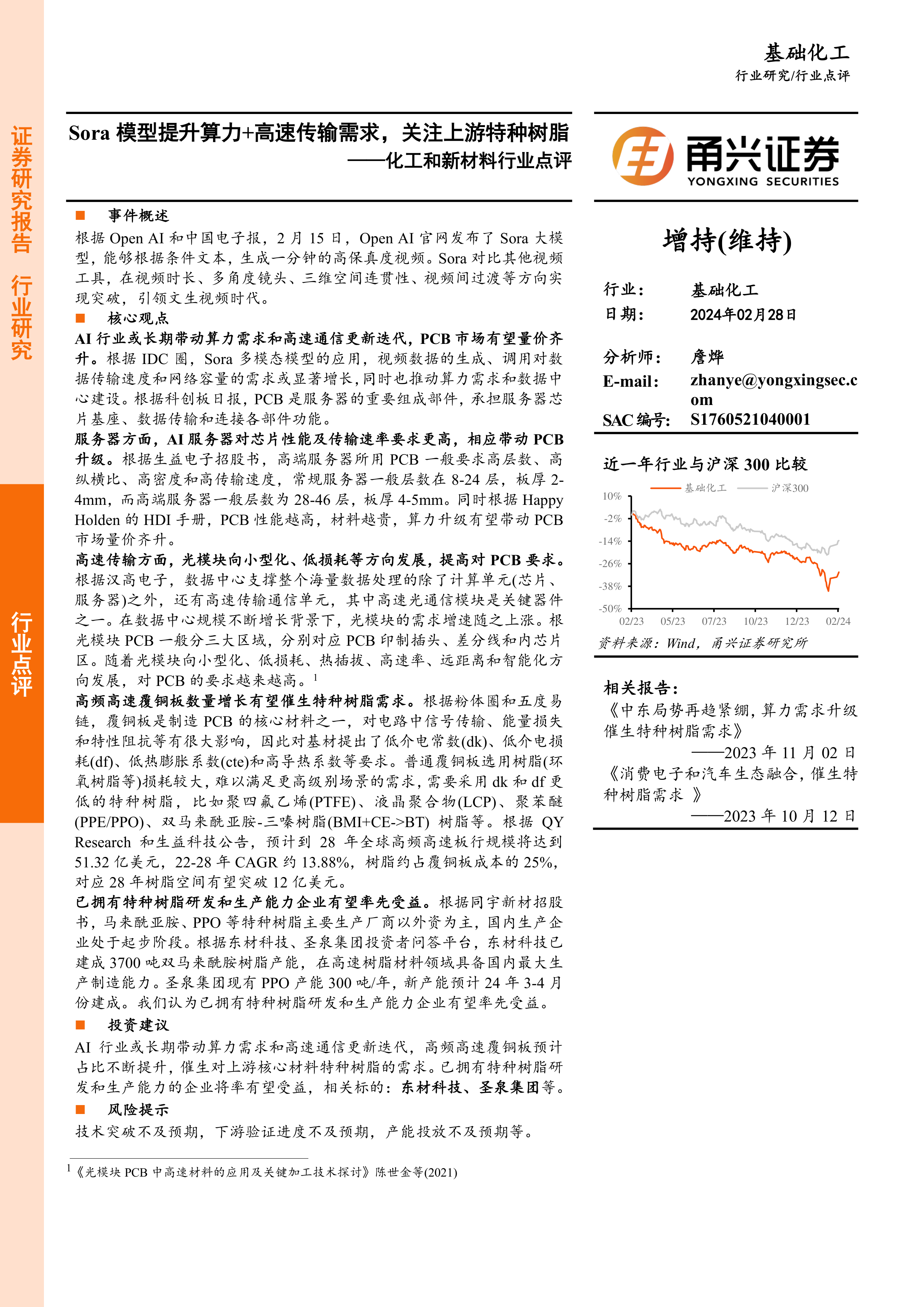 化工和新材料行业点评:Sora模型提升算力+高速传输需求,关注上游特种树脂