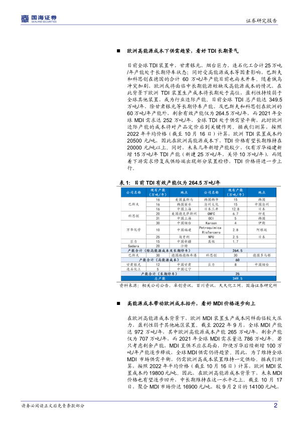 目前全球TDI装置中,甘肃银光、烟台巨力、连石化工合计25万吨/年产能处于长期停车状态;同时受高能源成本等因素影响,巴斯夫和科思创在德国的合计60万吨/年产能目前也尚未开车。随着俄乌冲突加剧,欧洲或将面临中长期能源短缺及高能源成本的情况,在此背景下欧洲TDI装置生产成本将长期处于高位,盈利性持续弱于全球其他装置,成为行业边际产能。目前全球TDI总产能达349.5万吨/年,除甘肃银光等长期停车产能、及巴斯夫和科思创在欧洲的60万吨/年产能外,剩余有效产能仅为264.5万吨/年,而2021年全球MDI需求达252万吨/年,全球TDI处于供需紧平衡,此时欧洲边际产能的成本将对产品定价启到关键作用。据我们测算,按照2022年平均价格(截至10月16日)计算,欧洲TDI装置成本约20500元/吨,因此在欧洲高能源成本下,TDI价格有望长期维持在20000元/吨以上。同时,未来几年新增产能较少,仅有万华福建新增15万吨/年TDI产能(新建25万吨/年,关停10万吨/年),而随着下游需求修复或供给端出现部分装置检修,TDI价格将进一步上行。