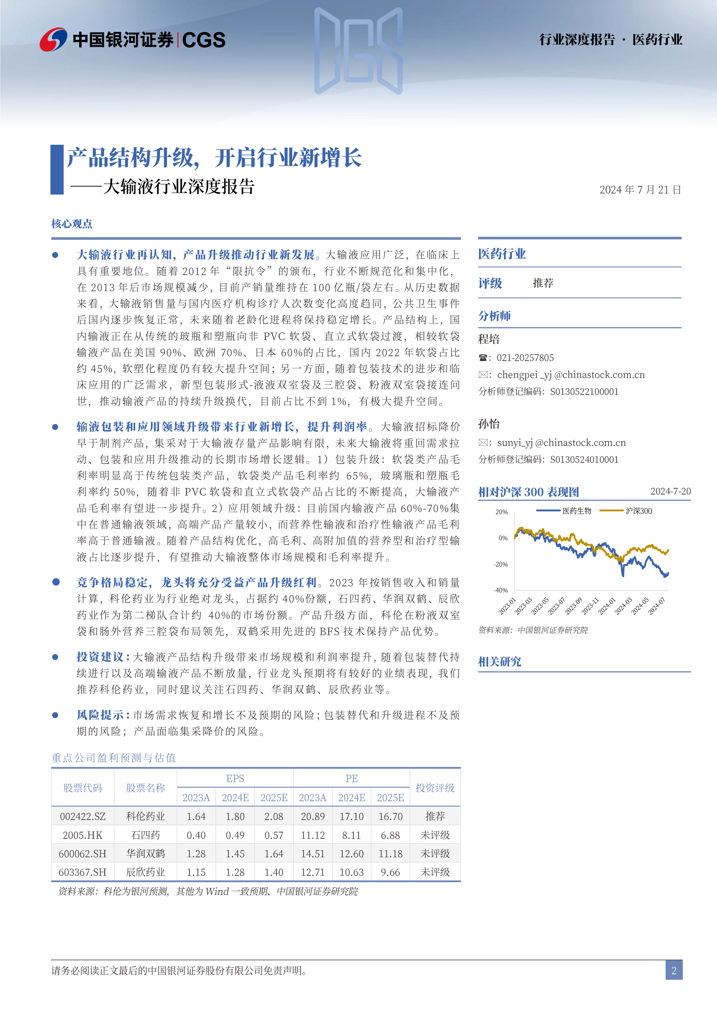 投资建议:大输液产品结构升级带来市场规模和利润率提升,随着包装替代持续进行以及高端输液产品不断放量,行业龙头预期将有较好的业绩表现,我们推荐科伦药业,同时建议关注石四药、华润双鹤、辰欣药业等。