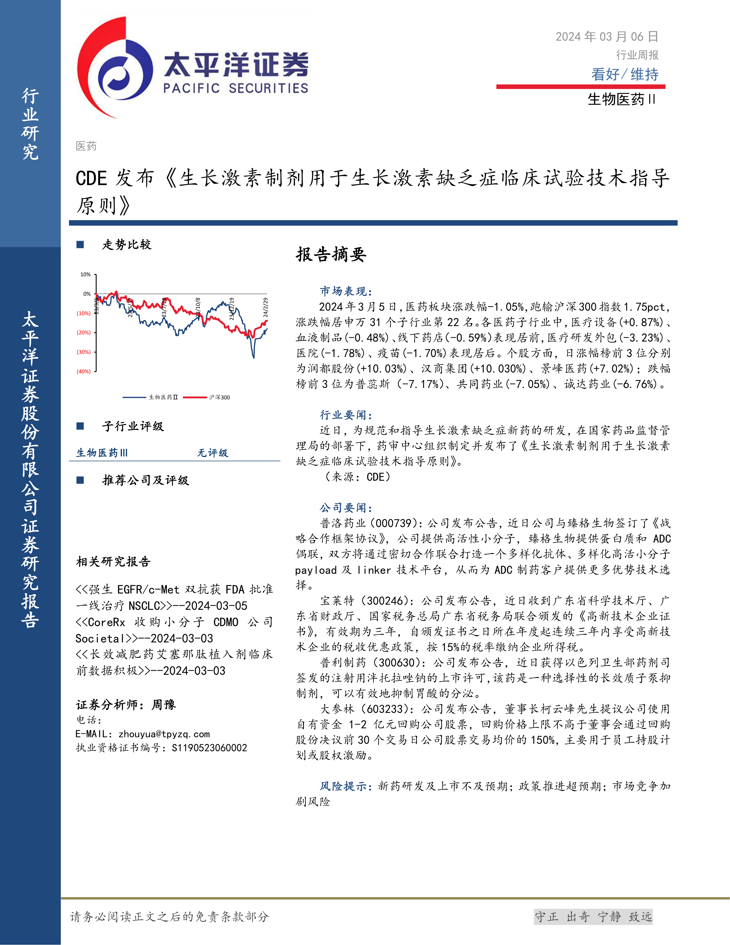 生物医药Ⅱ行业周报:CDE发布《生长激素制剂用于生长激素缺乏症临床试验技术指导原则》