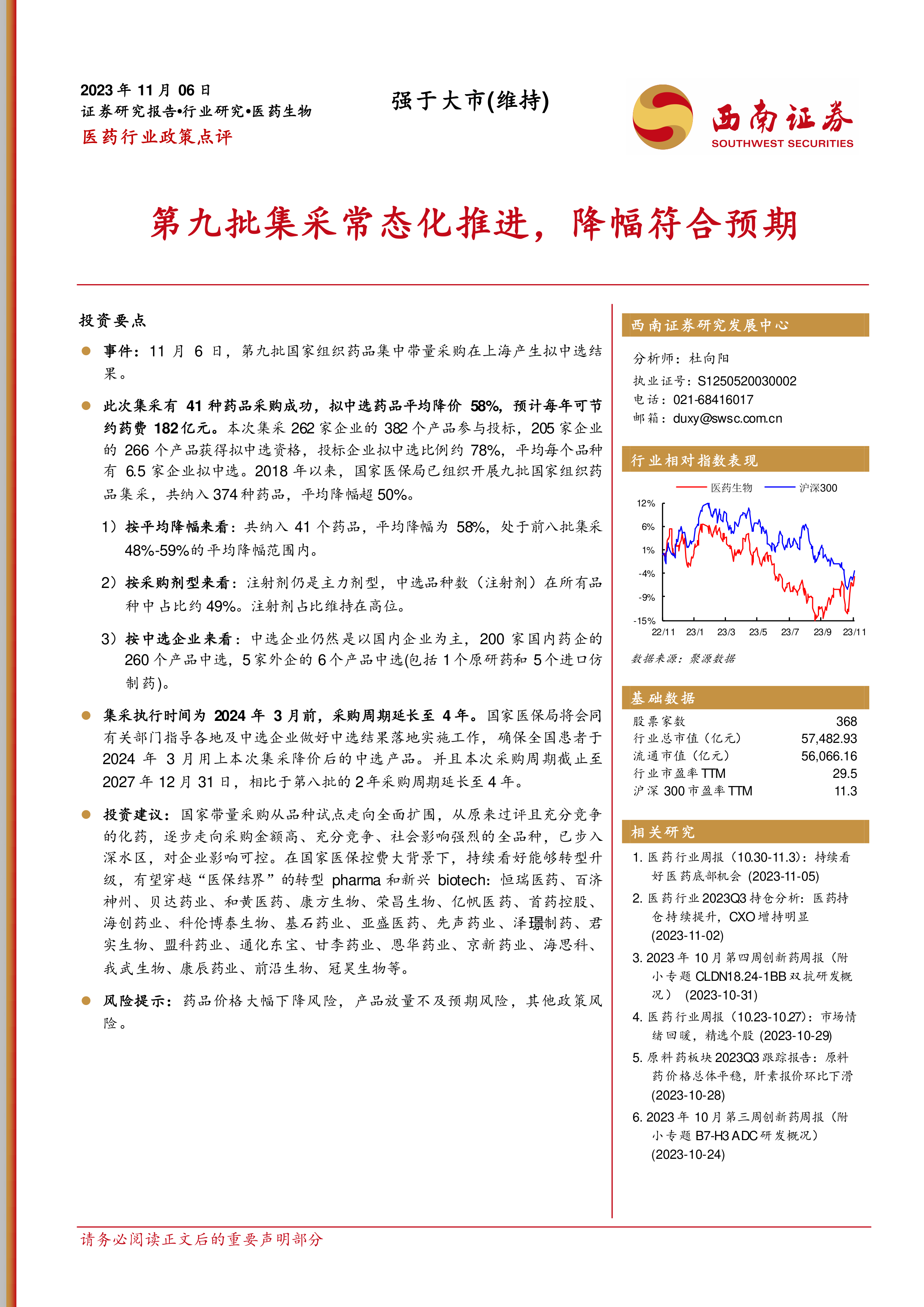 本报告分析了第九批国家组织药品集中带量采购的结果,指出其平均降幅符合预期,并强调了集采常态化对行业的影响。报告维持对医药生物行业的“强于大市”评级,并建议关注转型 pharma 和新兴 biotech 领域中的优质企业。同时,报告也提示了药品价格下降、产品放量不及预期以及其他政策风险。
