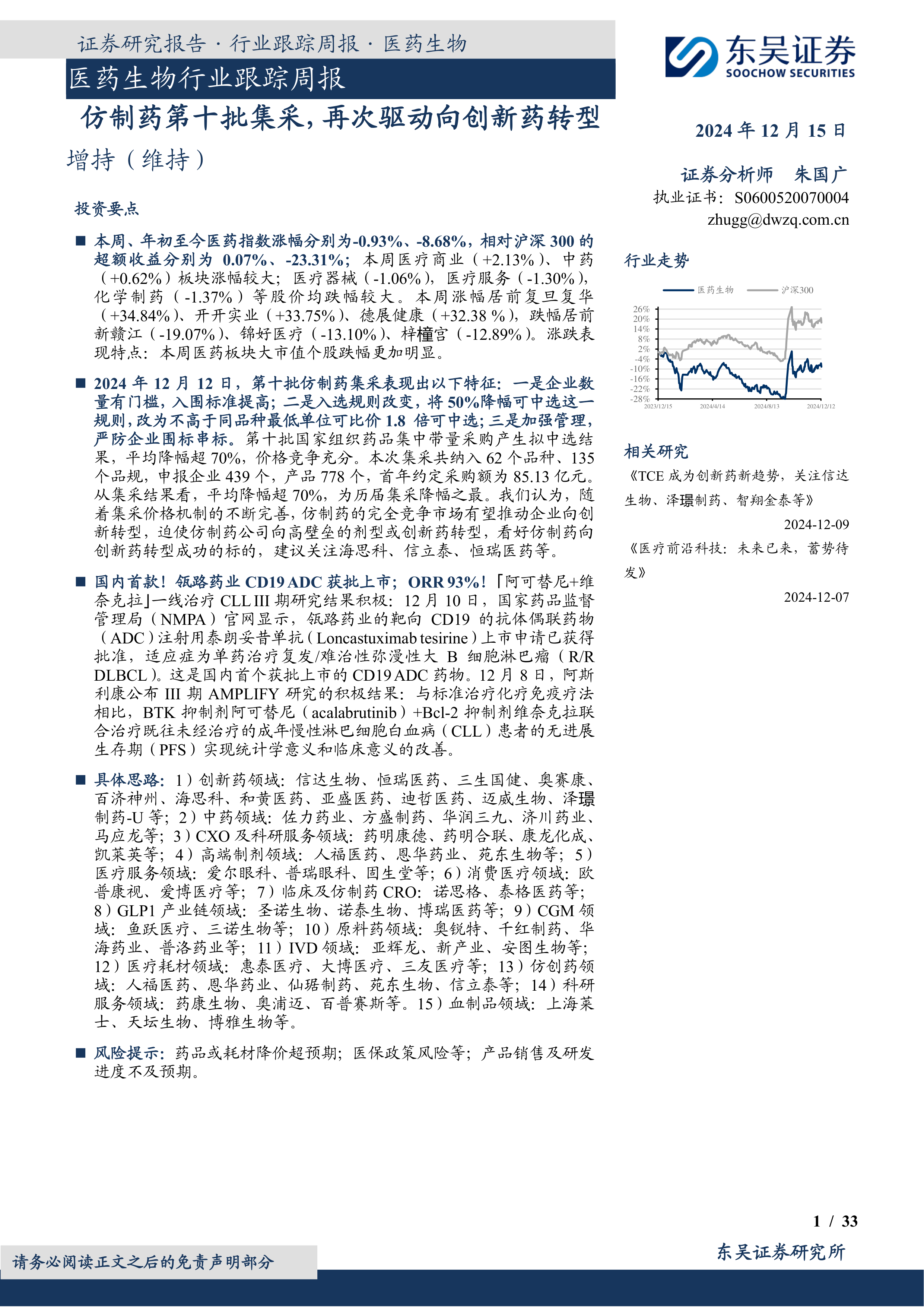 制药-U等;2)中药领域:佐力药业、方盛制药、华润三九、济川药业、马应龙等;3)CXO及科研服务领域:药明康德、药明合联、康龙化成、凯莱英等;4)高端制剂领域:人福医药、恩华药业、苑东生物等;5)医疗服务领域:爱尔眼科、普瑞眼科、固生堂等;6)消费医疗领域:欧普康视、爱博医疗等;7)临床及仿制药CRO:诺思格、泰格医药等;8)GLP1产业链领域:圣诺生物、诺泰生物、博瑞医药等;9)CGM领域:鱼跃医疗、三诺生物等;10)原料药领域:奥锐特、千红制药、华海药业、普洛药业等;11)IVD领域:亚辉龙、新产业、安图生物等;12)医疗耗材领域:惠泰医疗、大博医疗、三友医疗等;13)仿创药领域:人福医药、恩华药业、仙琚制药、苑东生物、信立泰等;14)科研服务领域:药康生物、奥浦迈、百普赛斯等。15)血制品领域:上海莱士、天坛生物、博雅生物等。