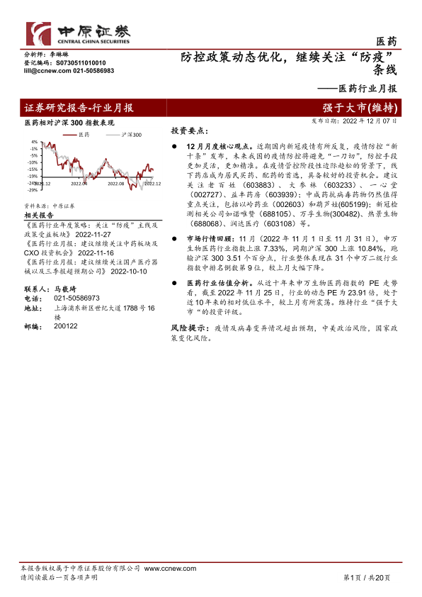 本报告分析了医药行业在疫情防控政策优化下的投资机会,重点关注线下药店、中成药抗病毒药物以及新冠检测相关公司。同时,报告对行业估值、原料药和中药材价格进行了分析,并提供了相关的投资建议。 投资者应关注行业风险,并结合自身情况谨慎决策。