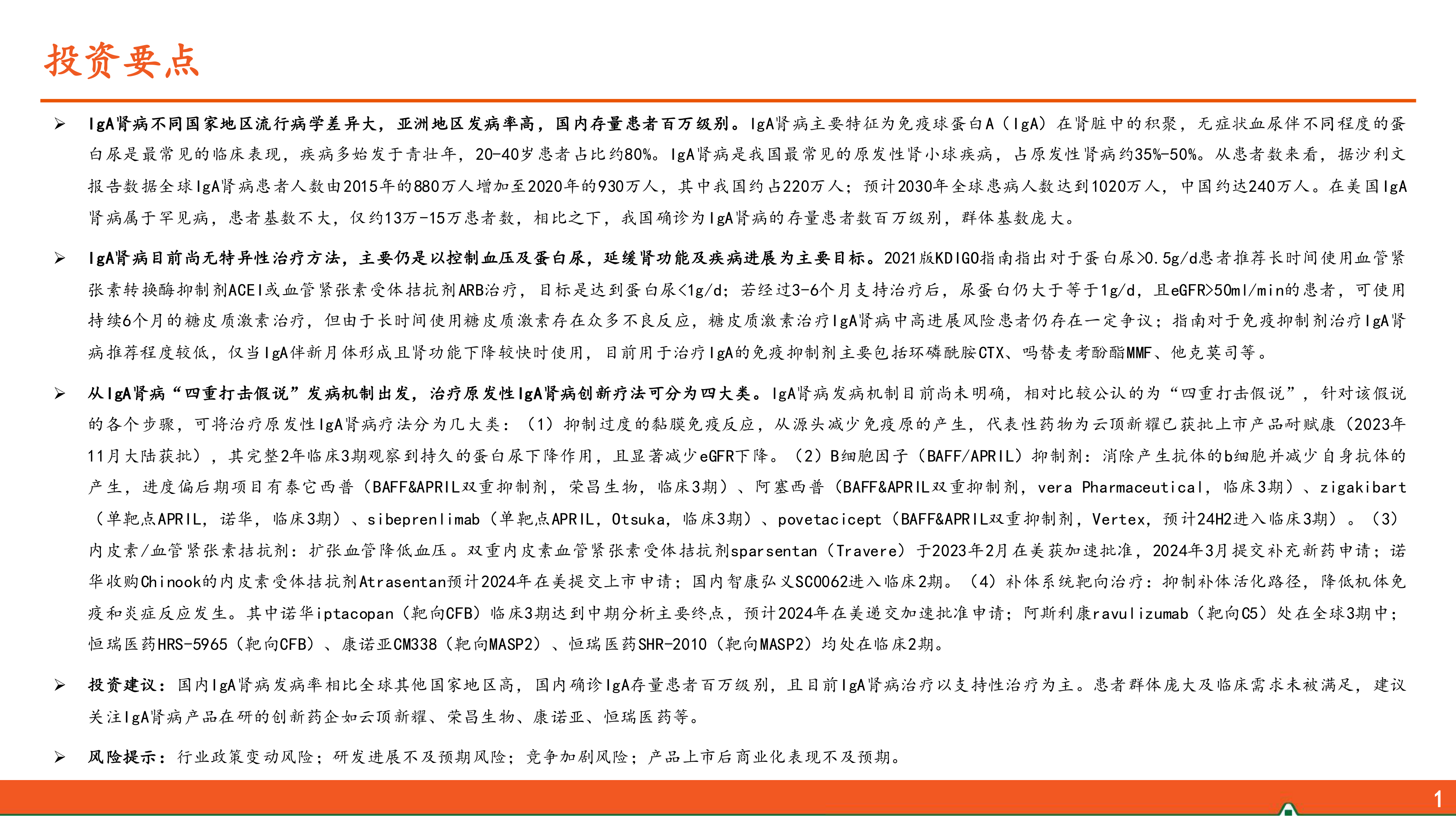 从IgA肾病“四重打击假说”发病机制出发,治疗原发性IgA肾病创新疗法可分为四大类。IgA肾病发病机制目前尚未明确,相对比较公认的为“四重打击假说”,针对该假说的各个步骤,可将治疗原发性IgA肾病疗法分为几大类:(1)抑制过度的黏膜免疫反应,从源头减少免疫原的产生,代表性药物为云顶新耀已获批上市产品耐赋康(2023年11月大陆获批),其完整2年临床3期观察到持久的蛋白尿下降作用,且显著减少eGFR下降。(2)B细胞因子(BAFF/APRIL)抑制剂:消除产生抗体的b细胞并减少自身抗体的产生,进度偏后期项目有泰它西普(BAFF&APRIL双重抑制剂,荣昌生物,临床3期)、阿塞西普(BAFF&APRIL双重抑制剂,vera Pharmaceutical,临床3期)、zigakibart(单靶点APRIL,诺华,临床3期)、sibeprenlimab(单靶点APRIL,Otsuka,临床3期)、povetacicept(BAFF&APRIL双重抑制剂,Vertex,预计24H2进入临床3期)。(3)内皮素/血管紧张素拮抗剂:扩张血管降低血压。双重内皮素血管紧张素受体拮抗剂sparsentan(Travere)于2023年2月在美获加速批准,2024年3月提交补充新药申请;诺华收购Chinook的内皮素受体拮抗剂Atrasentan预计2024年在美提交上市申请;国内智康弘义SC0062进入临床2期。(4)补体系统靶向治疗:抑制补体活化路径,降低机体免疫和炎症反应发生。其中诺华iptacopan(靶向CFB)临床3期达到中期分析主要终点,预计2024年在美递交加速批准申请;阿斯利康ravulizumab(靶向C5)处在全球3期中;恒瑞医药HRS-5965(靶向CFB)、康诺亚CM338(靶向MASP2)、恒瑞医药SHR-2010(靶向MASP2)均处在临床2期。