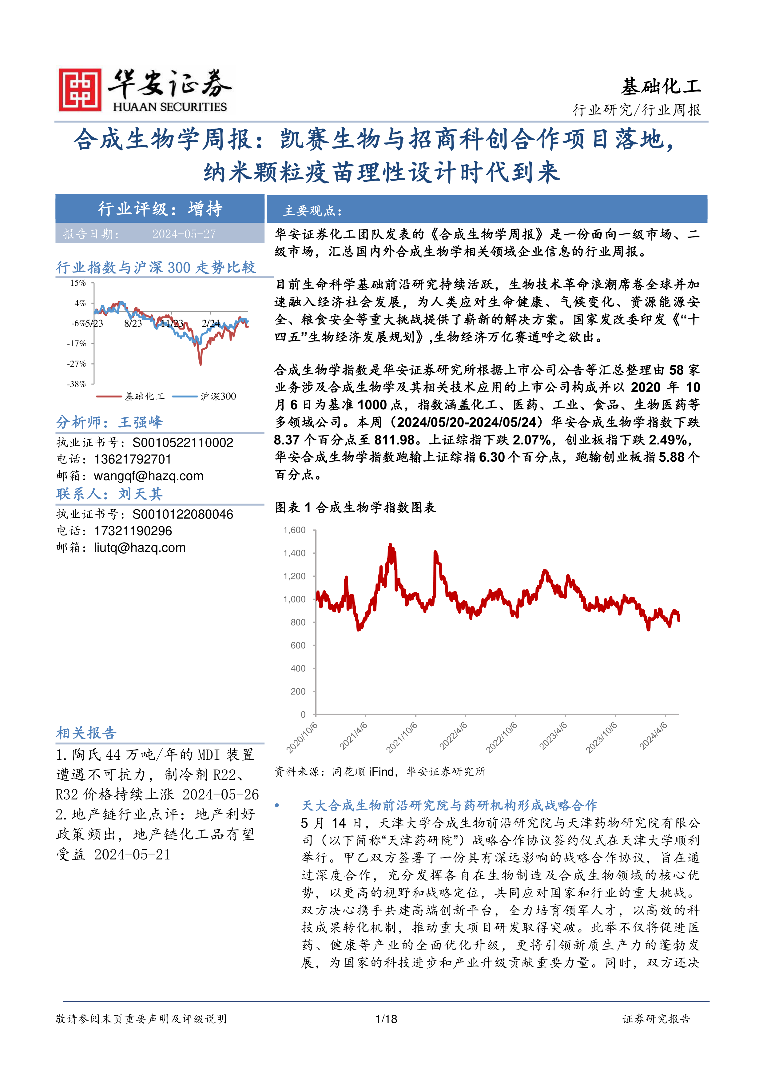 合成生物学指数是华安证券研究所根据上市公司公告等汇总整理由58家业务涉及合成生物学及其相关技术应用的上市公司构成并以2020年10月6日为基准1000点,指数涵盖化工、医药、工业、食品、生物医药等多领域公司。本周(2024/05/20-2024/05/24)华安合成生物学指数下跌8.37个百分点至811.98。上证综指下跌2.07%,创业板指下跌2.49%,华安合成生物学指数跑输上证综指6.30个百分点,跑输创业板指5.88个百分点。