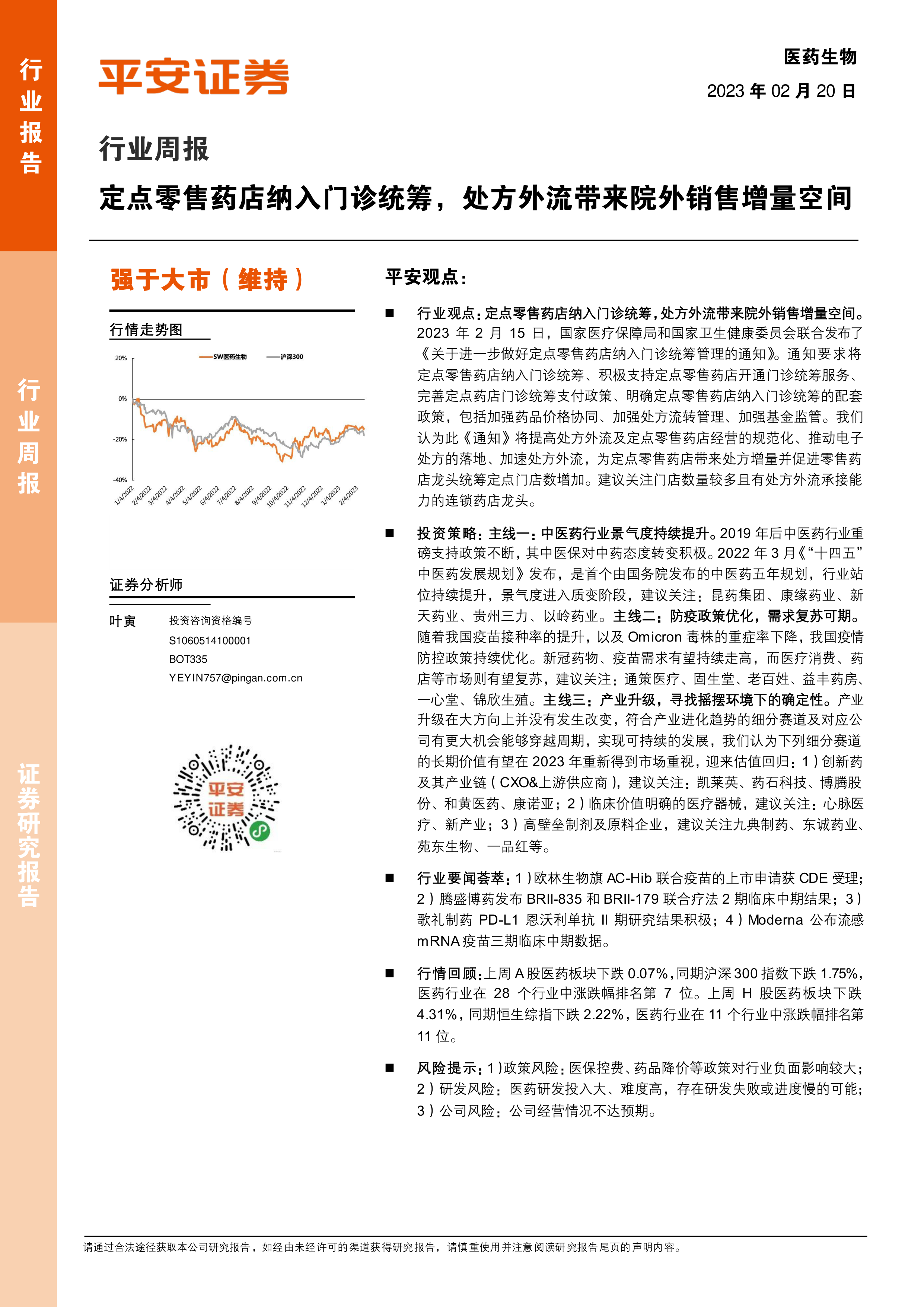 本报告重点关注了定点零售药店纳入门诊统筹政策对医药行业的影响,认为该政策将推动处方外流,利好连锁药店龙头。同时,报告提出了中医药、防疫优化、产业升级三大投资主线,并对相关细分领域的重点公司进行了分析。此外,报告还回顾了A股和港股医药板块的行情表现,并对行业要闻进行了梳理。