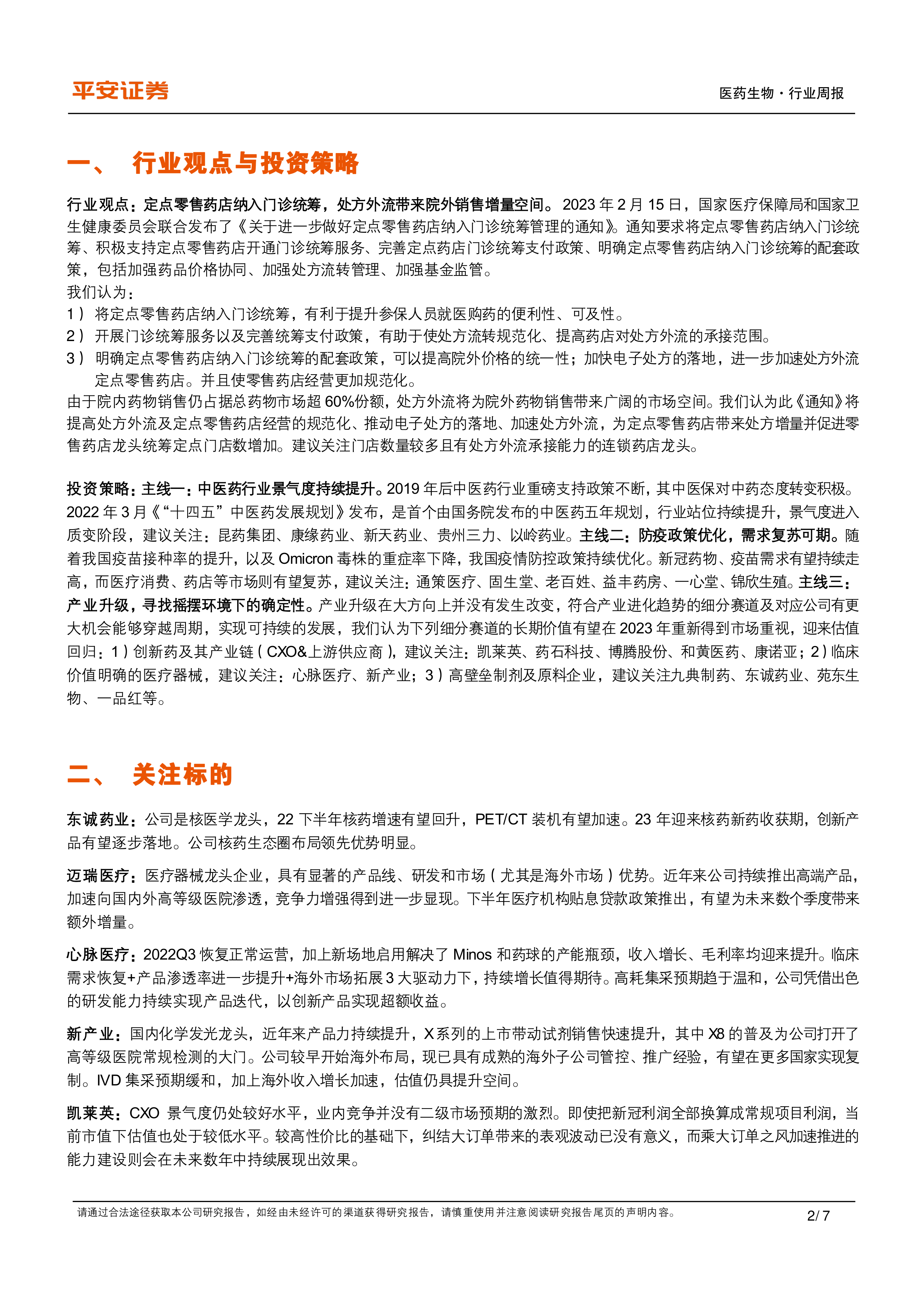 行业观点:定点零售药店纳入门诊统筹,处方外流带来院外销售增量空间。2023年2月15日,国家医疗保障局和国家卫生健康委员会联合发布了《关于进一步做好定点零售药店纳入门诊统筹管理的通知》。通知要求将定点零售药店纳入门诊统筹、积极支持定点零售药店开通门诊统筹服务、完善定点药店门诊统筹支付政策、明确定点零售药店纳入门诊统筹的配套政策,包括加强药品价格协同、加强处方流转管理、加强基金监管。我们认为此《通知》将提高处方外流及定点零售药店经营的规范化、推动电子处方的落地、加速处方外流,为定点零售药店带来处方增量并促进零售药店龙头统筹定点门店数增加。建议关注门店数量较多且有处方外流承接能力的连锁药店龙头。