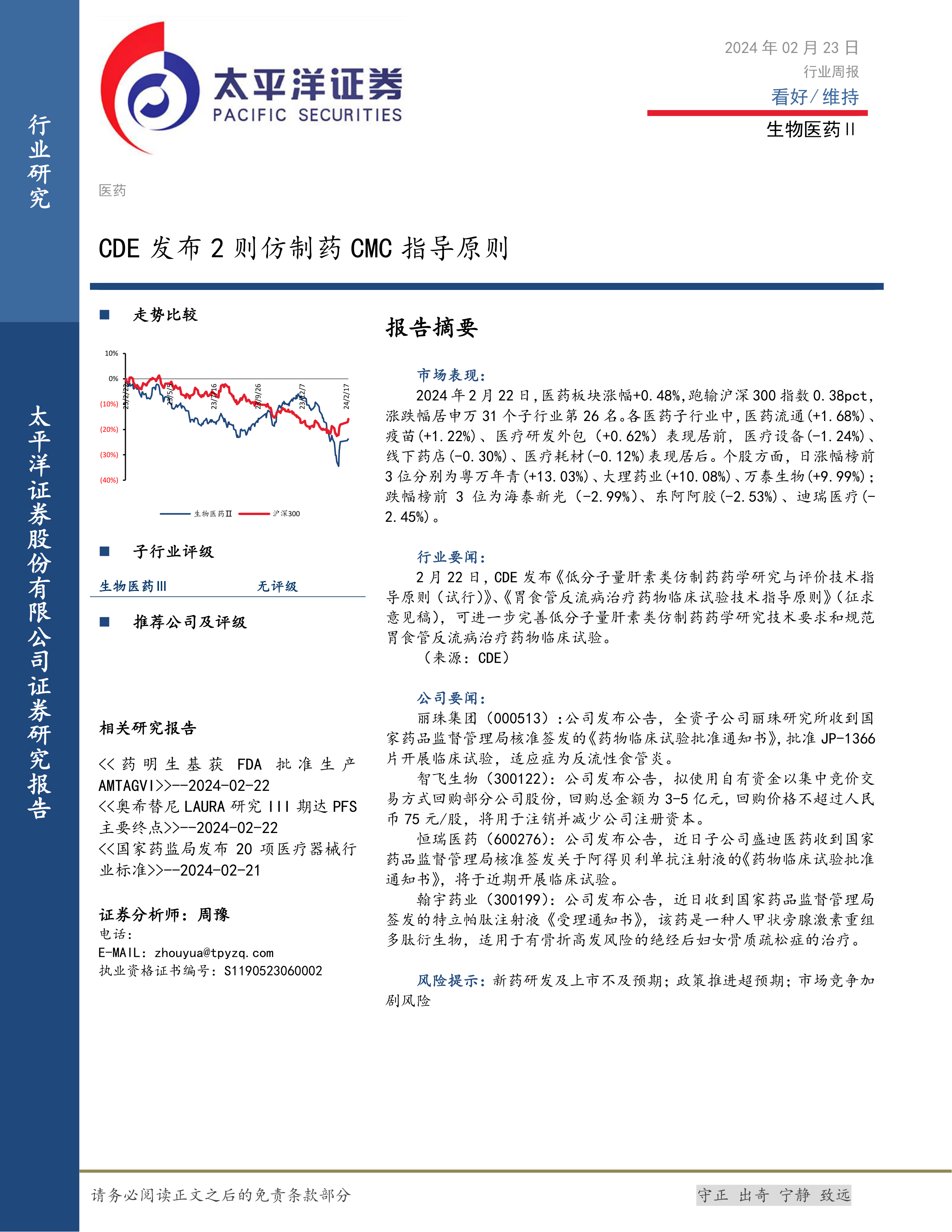 本报告对2024年2月生物医药行业进行了全面的分析,涵盖了市场表现、行业政策、公司动态和投资建议。 报告指出,CDE发布的仿制药指导原则将对行业产生积极影响,同时,各公司在研发和临床试验方面的进展也值得关注。 报告维持对生物医药行业的“看好”评级,并为投资者提供了具体的个股表现和投资参考。