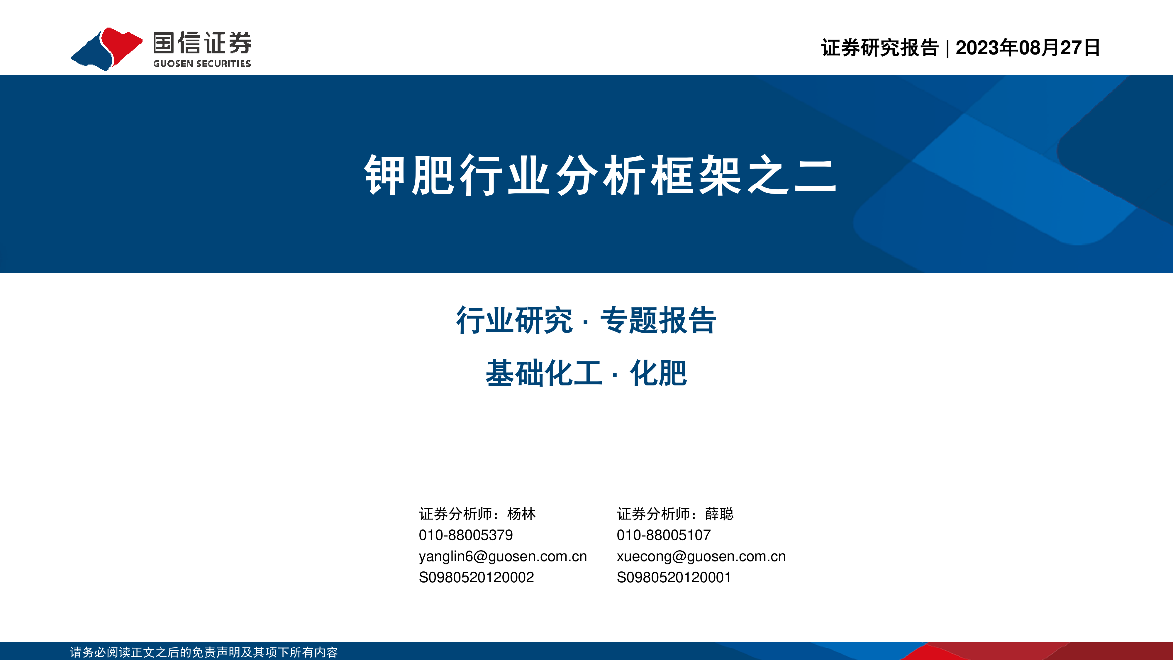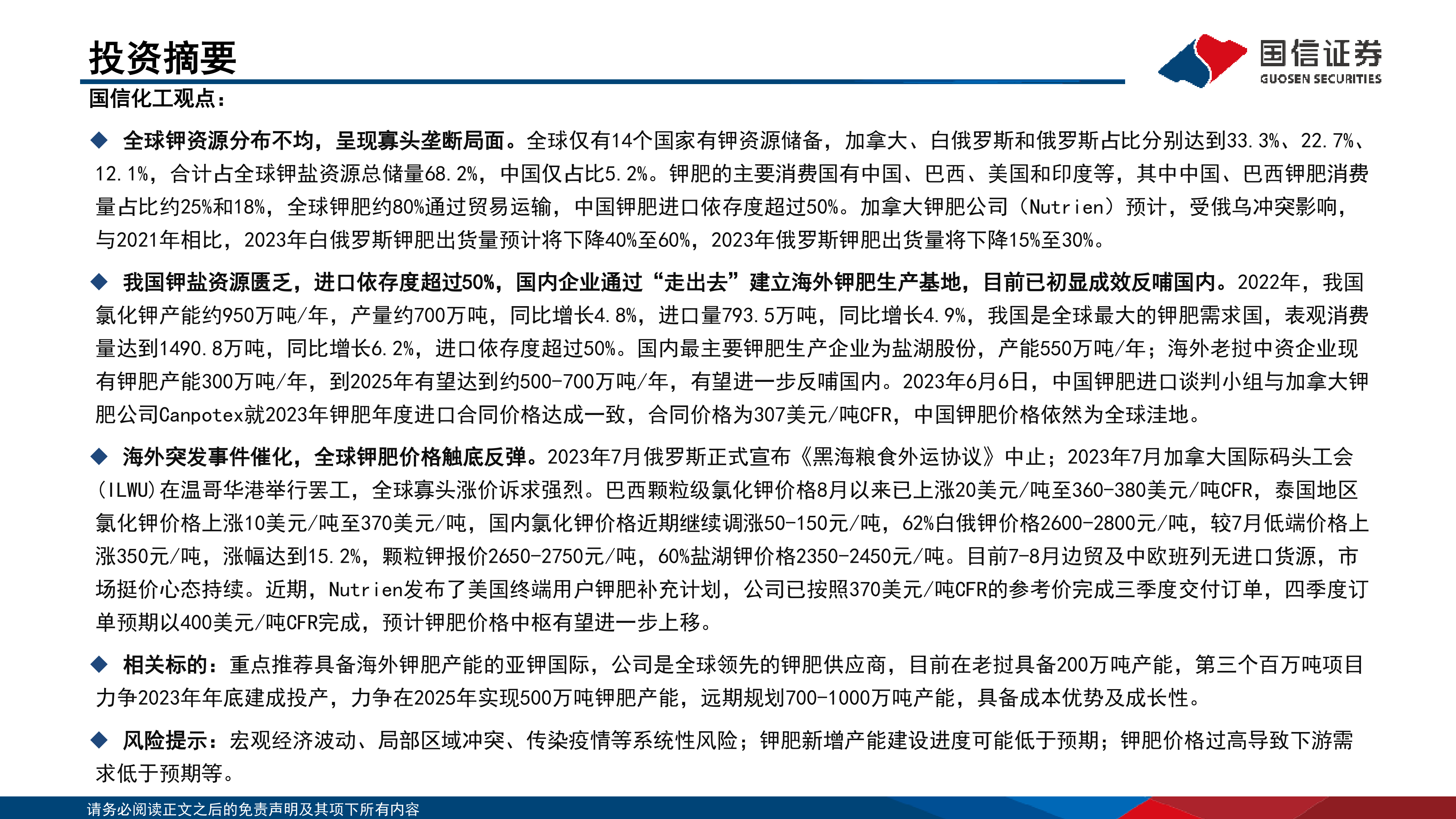 风险提示:宏观经济波动、局部区域冲突、传染疫情等系统性风险;钾肥新增产能建设进度可能低于预期;钾肥价格过高导致下游需求低于预期等。