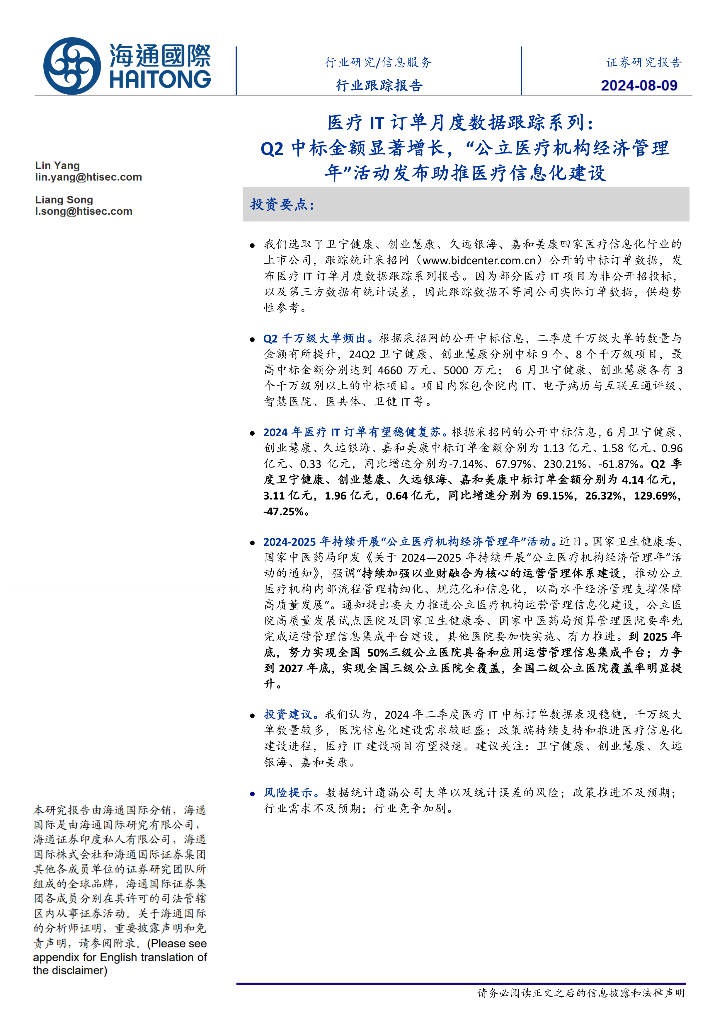 投资建议。我们认为,2024年二季度医疗IT中标订单数据表现稳健,千万级大单数量较多,医院信息化建设需求较旺盛;政策端持续支持和推进医疗信息化建设进程,医疗IT建设项目有望提速。建议关注:卫宁健康、创业慧康、久远银海、嘉和美康。
