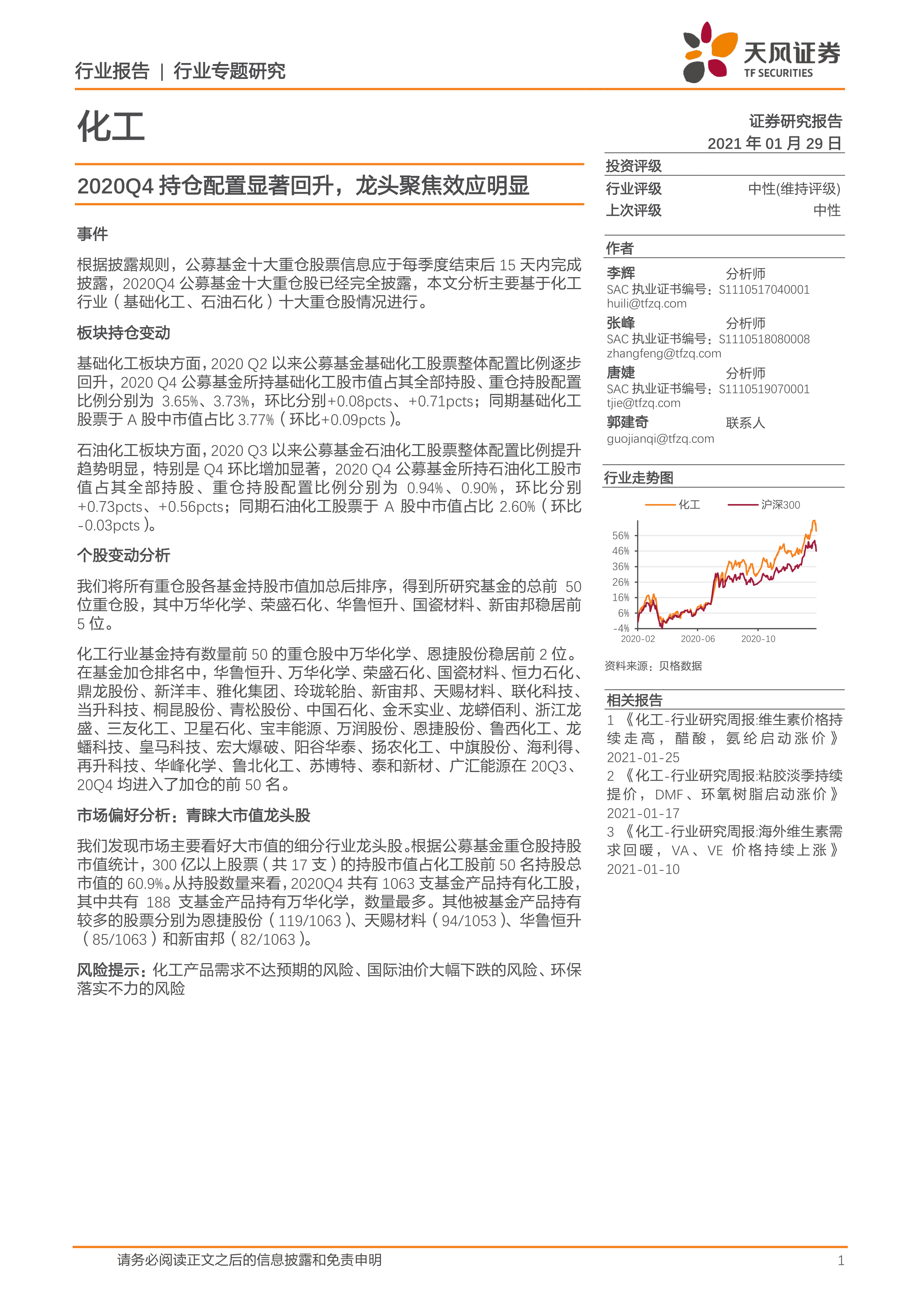 化工行业专题研究:2020Q4持仓配置显著回升,龙头聚焦效应明显