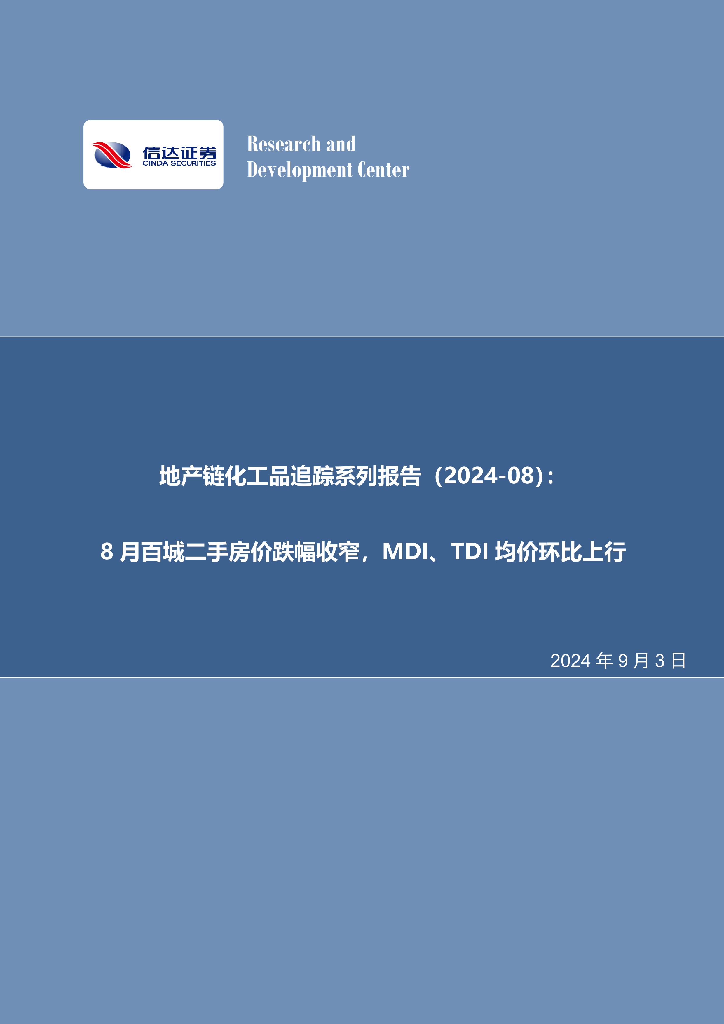 地产链化工品追踪系列报告(2024-08):8月百城二手房价跌幅收窄,MDI、TDI均价环比上行