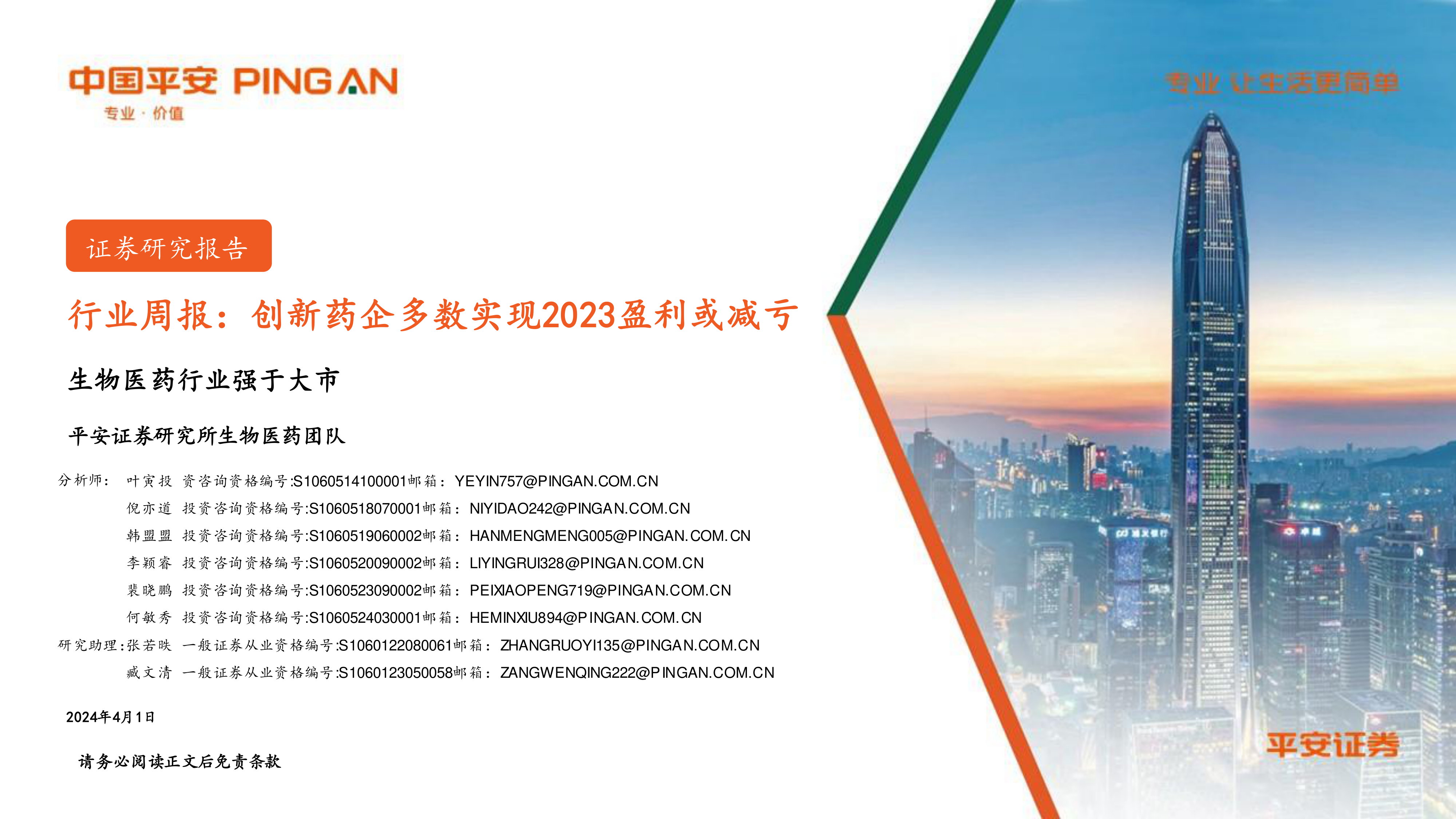 生物医药行业周报:创新药企多数实现2023盈利或减亏