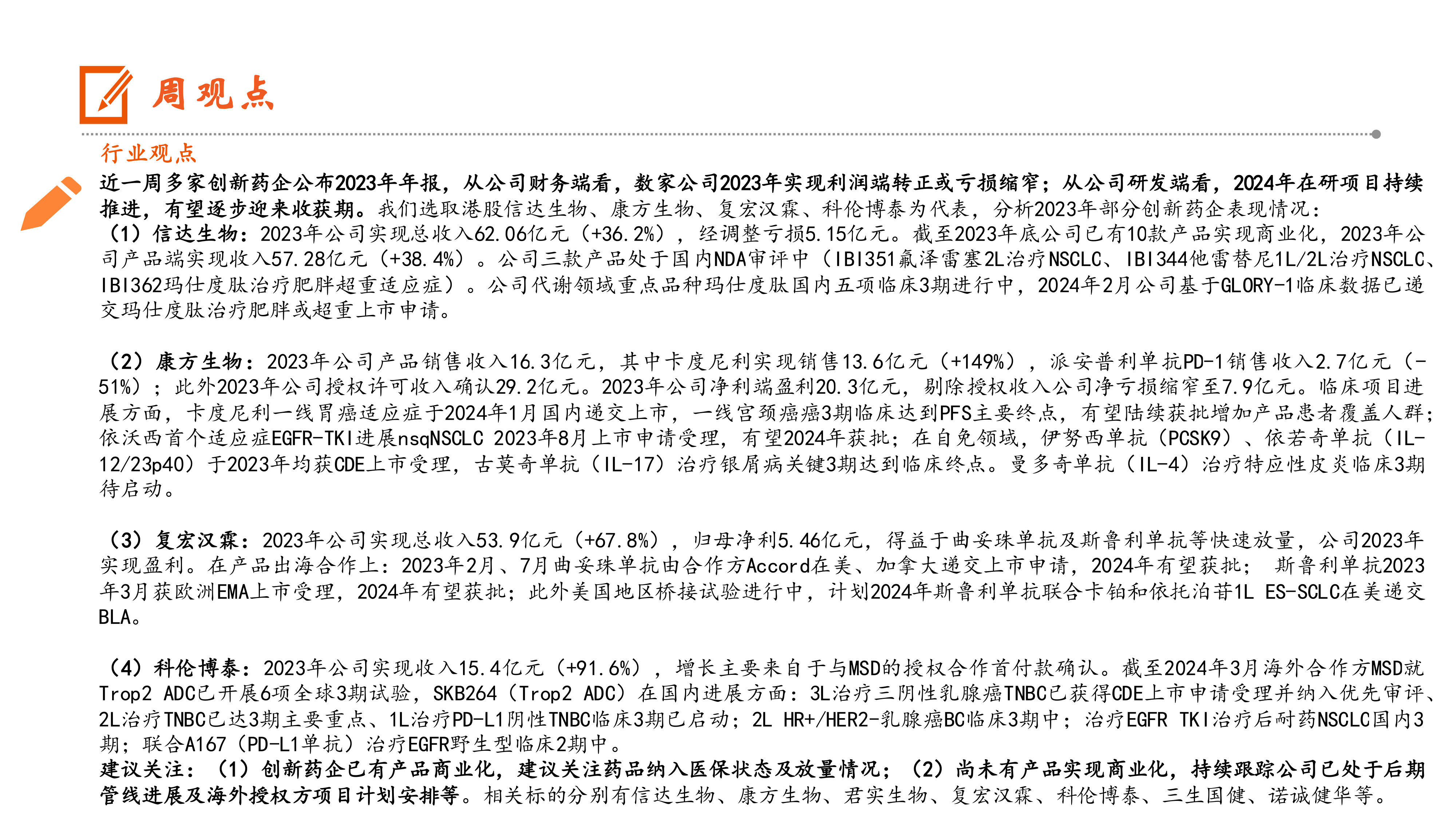 近一周多家创新药企公布2023年年报,从公司财务端看,数家公司2023年实现利润端转正或亏损缩窄;从公司研发端看,2024年在研项目持续推进,有望逐步迎来收获期。我们选取港股信达生物、康方生物、复宏汉霖、科伦博泰为代表,分析2023年部分创新药企表现情况: