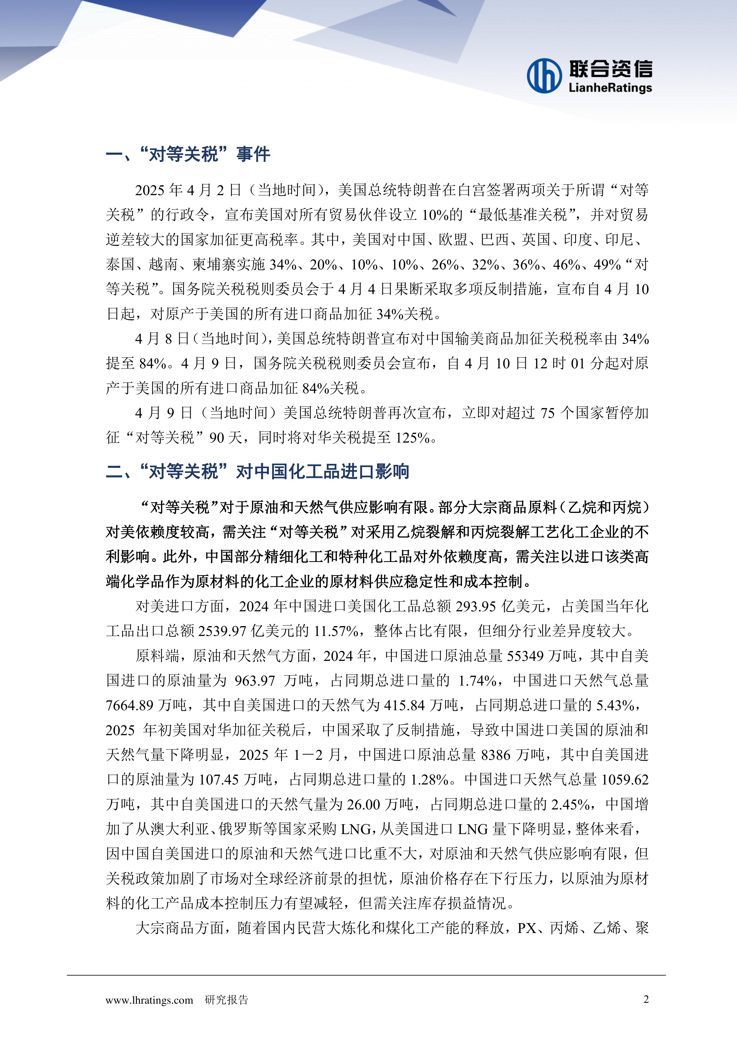 进口方面,“对等关税”对于原油和天然气供应影响有限,关注企业库存收益情况。部分大宗商品原料(乙烷和丙烷)对美依赖度较高,需关注“对等关税”对采用乙烷裂解和丙烷裂解工艺化工企业的不利影响。此外,中国在部分精细化工和特种化工品领域对外依赖度高,需关注以进口美国高端化学品作为原材料的化工企业的原材料供应稳定性和成本控制。