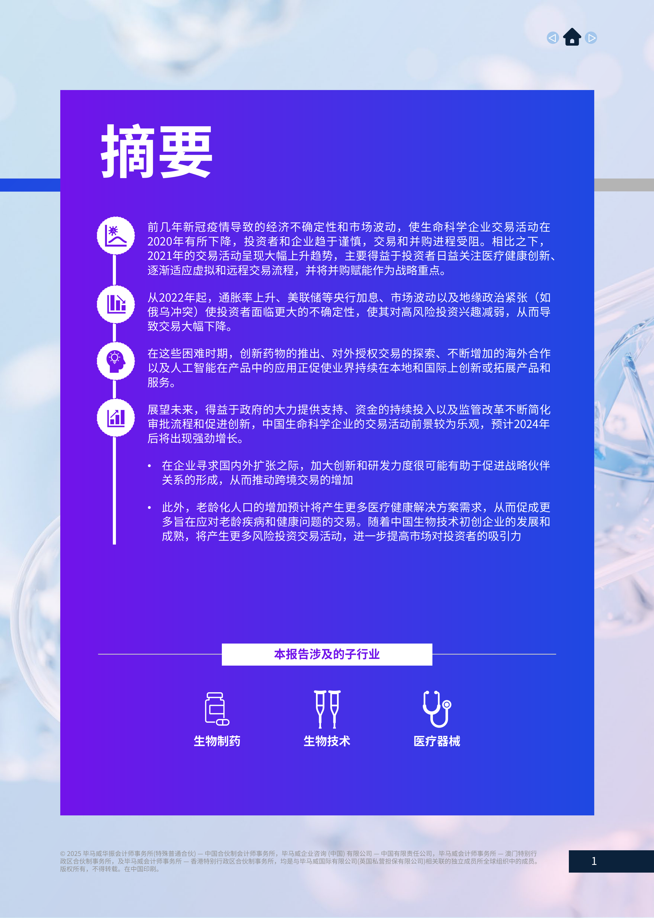 本报告分析了中国生命科学行业的宏观经济形势、行业发展趋势和交易活动,并对未来发展进行了展望。 报告指出,尽管行业受到宏观经济和政策影响,但预计2024年后将迎来强劲增长。 关键驱动因素包括政府支持、技术创新、人口老龄化以及对外合作。 报告还强调了人工智能、机器人技术等新兴技术的重要性,以及创新药物和对外授权交易的增长潜力。 此外,报告概述了行业相关的关键法规,为行业参与者提供了重要的参考。