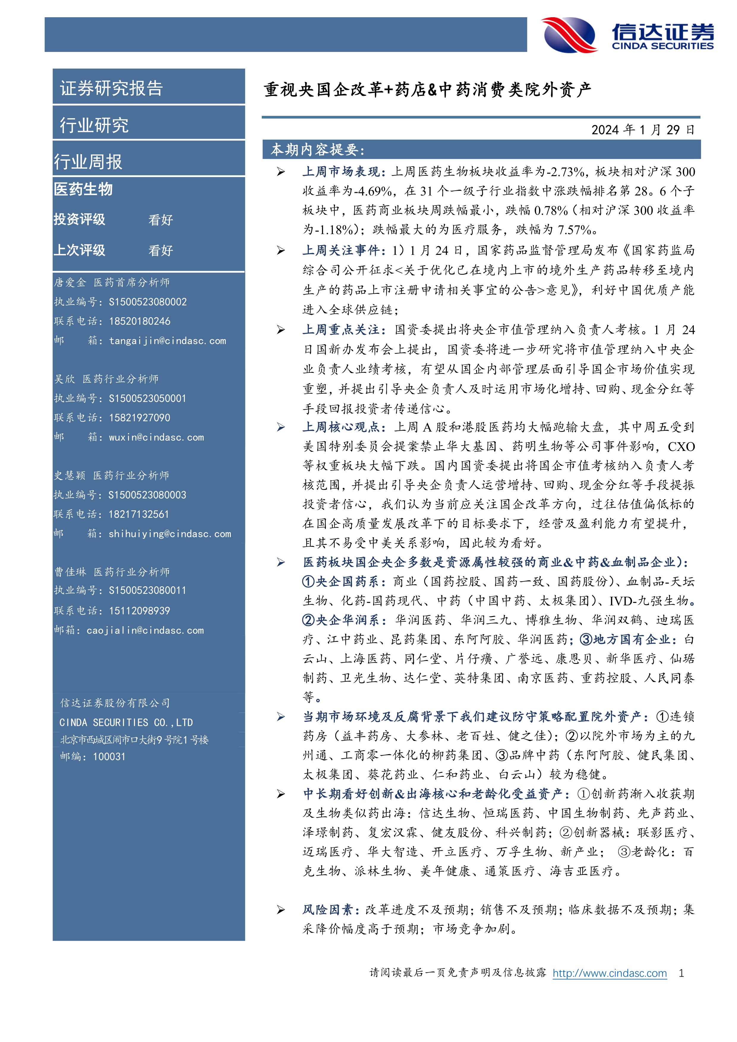 医药生物行业周报:重视央国企改革+药店&中药消费类院外资产
