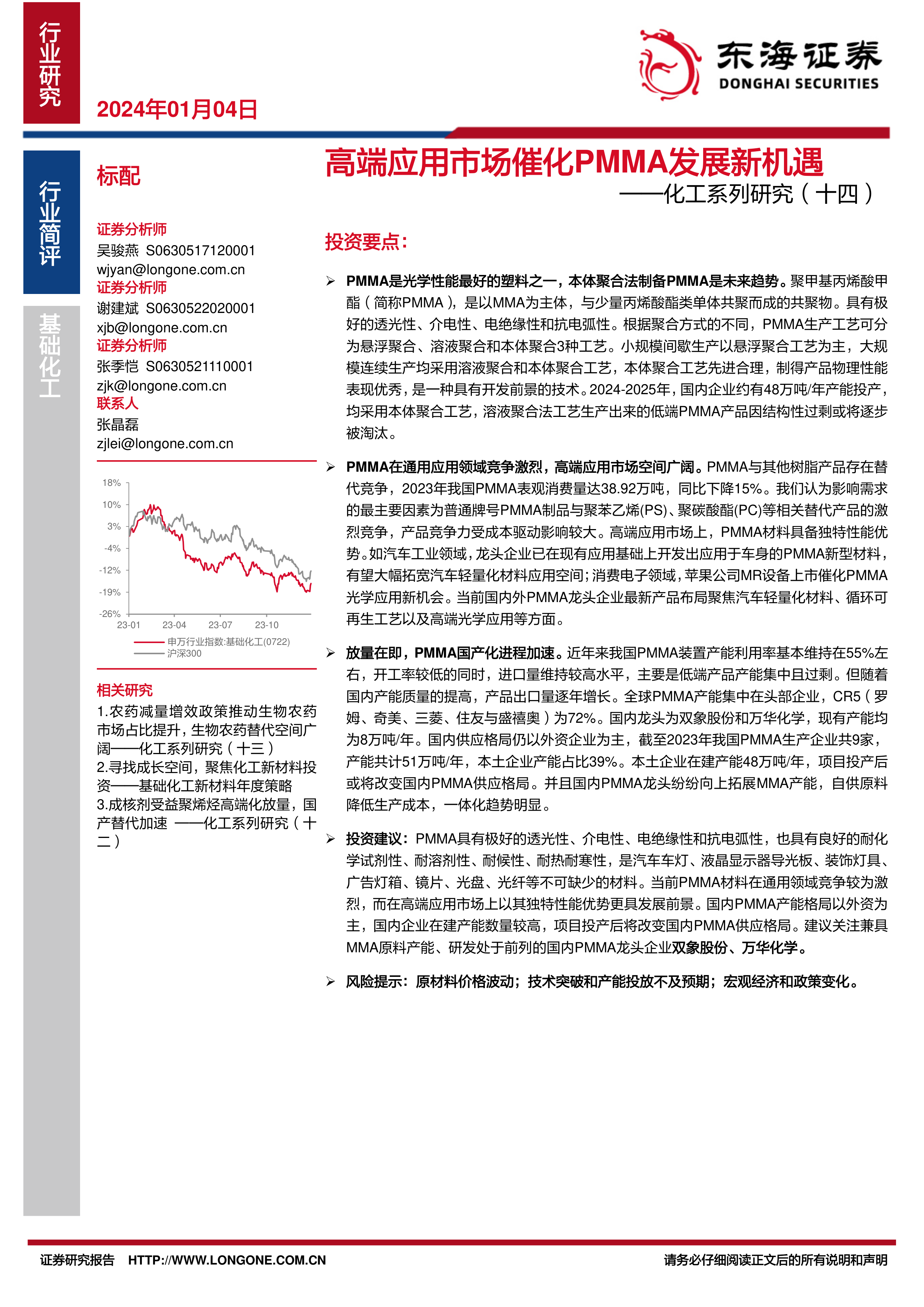 本报告深入分析了PMMA市场的现状与发展趋势。 报告指出,PMMA作为一种性能优异的塑料,在高端应用领域具有广阔的市场前景。 随着本体聚合技术的成熟和国产化进程的加速,国内PMMA市场格局有望发生改变。 建议投资者关注具备MMA原料产能、研发领先的国内PMMA龙头企业,把握行业发展机遇。