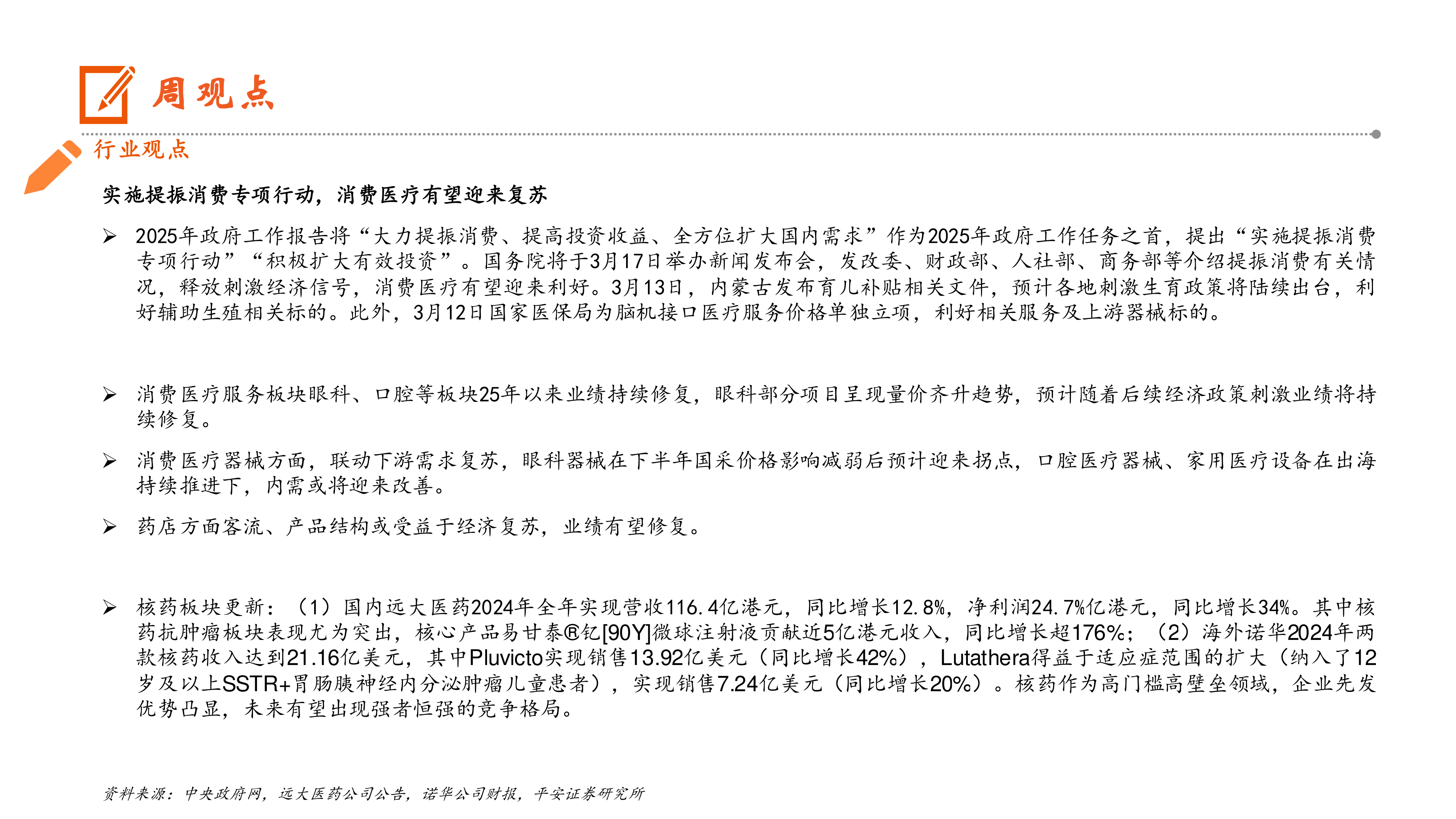 2025年政府工作报告将“大力提振消费、提高投资收益、全方位扩大国内需求”作为2025年政府工作任务之首,提出“实施提振消费专项行动”“积极扩大有效投资”。国务院将于3月17日举办新闻发布会,发改委、财政部、人社部、商务部等介绍提振消费有关情况,释放刺激经济信号,消费医疗有望迎来利好。3月13日,内蒙古发布育儿补贴相关文件,预计各地刺激生育政策将陆续出台,利好辅助生殖相关标的。此外,3月12日国家医保局为脑机接口医疗服务价格单独立项,利好相关服务及上游器械标的。