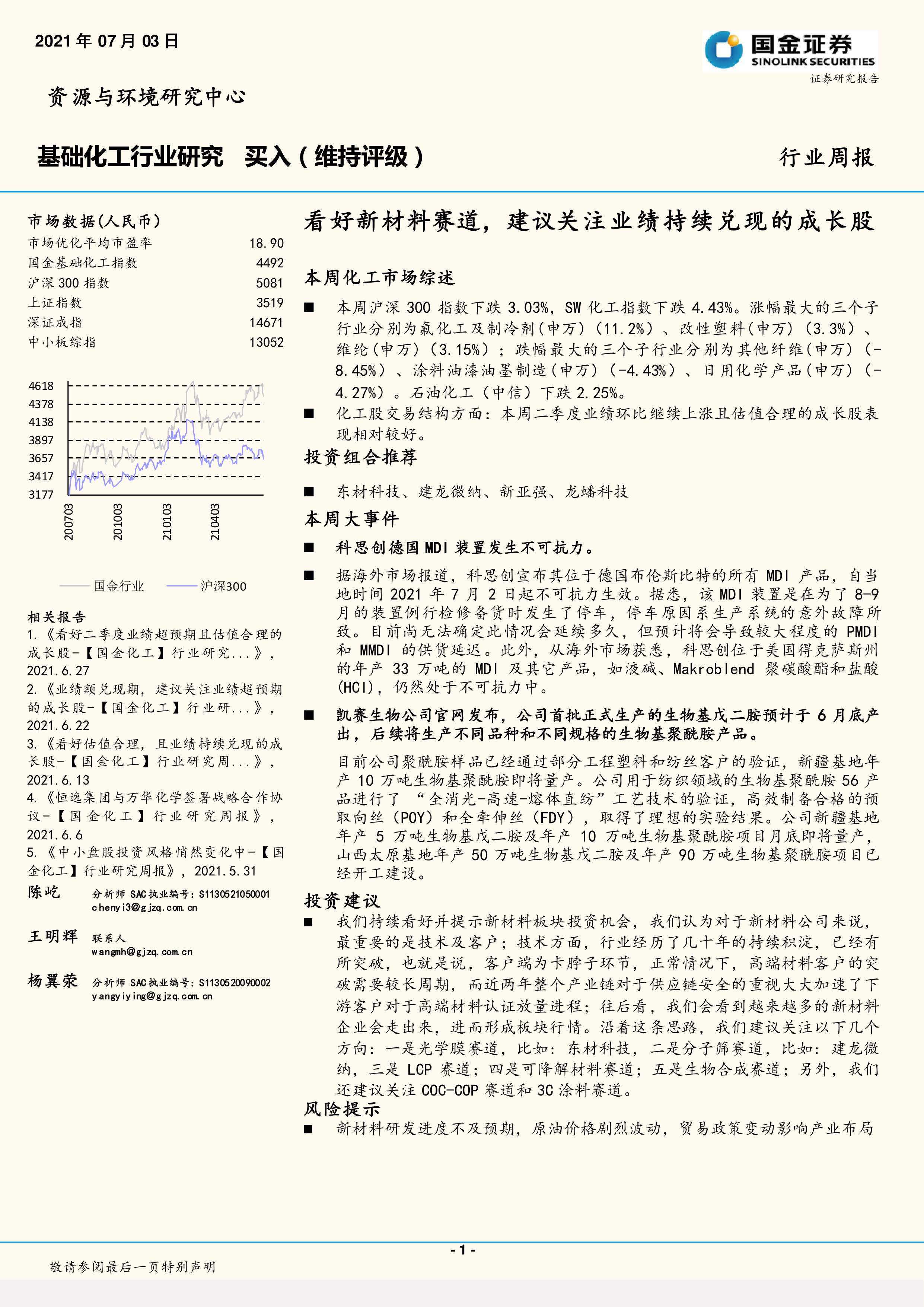 本报告的核心观点是持续看好新材料板块的投资机会,并建议关注业绩持续兑现的成长股。报告基于对市场数据的分析,以及对近期化工市场走势和主要化工产品价格的解读,提出了具体的投资建议。