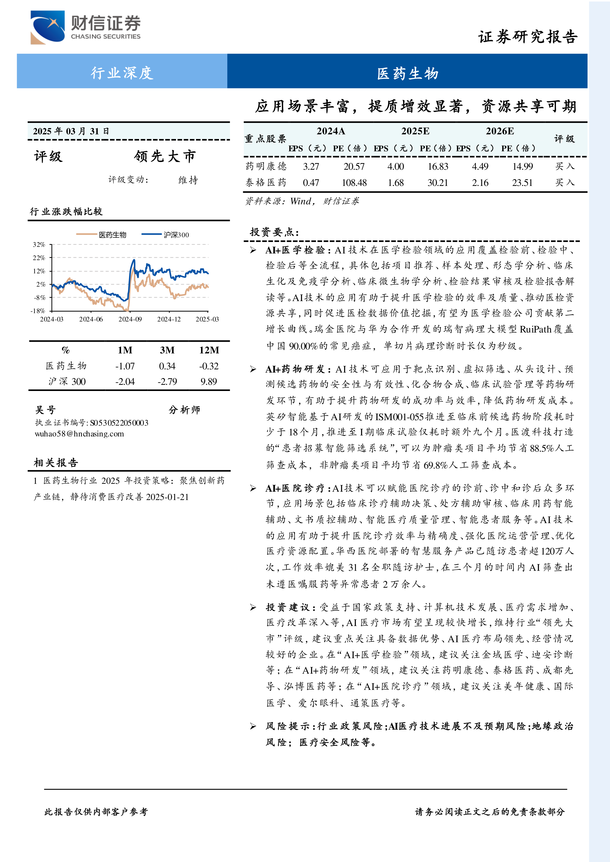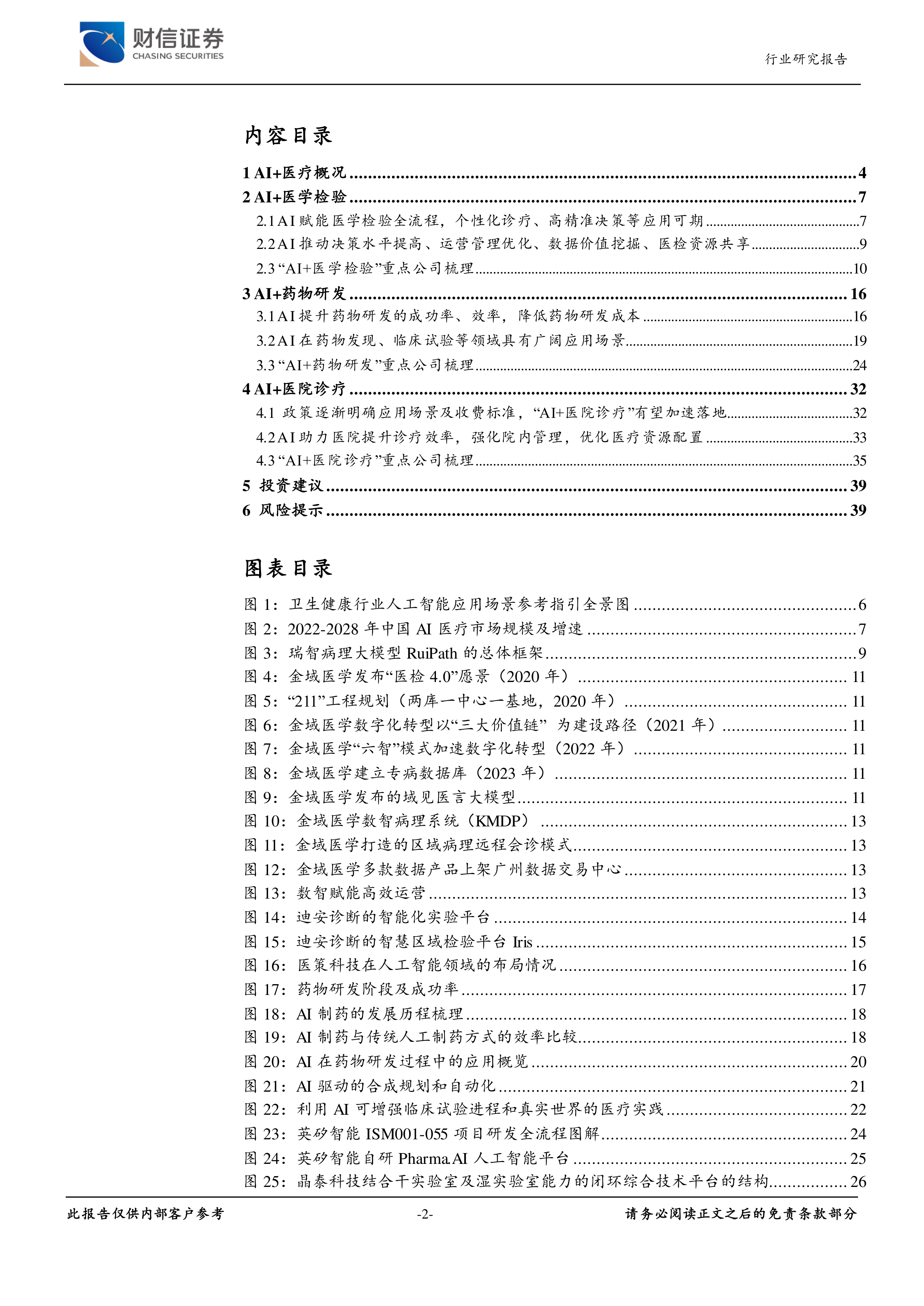 本报告详细分析了AI在医药生物行业的应用,并对相关上市公司进行了深入研究。报告结构清晰,内容翔实,主要包括以下几个部分: