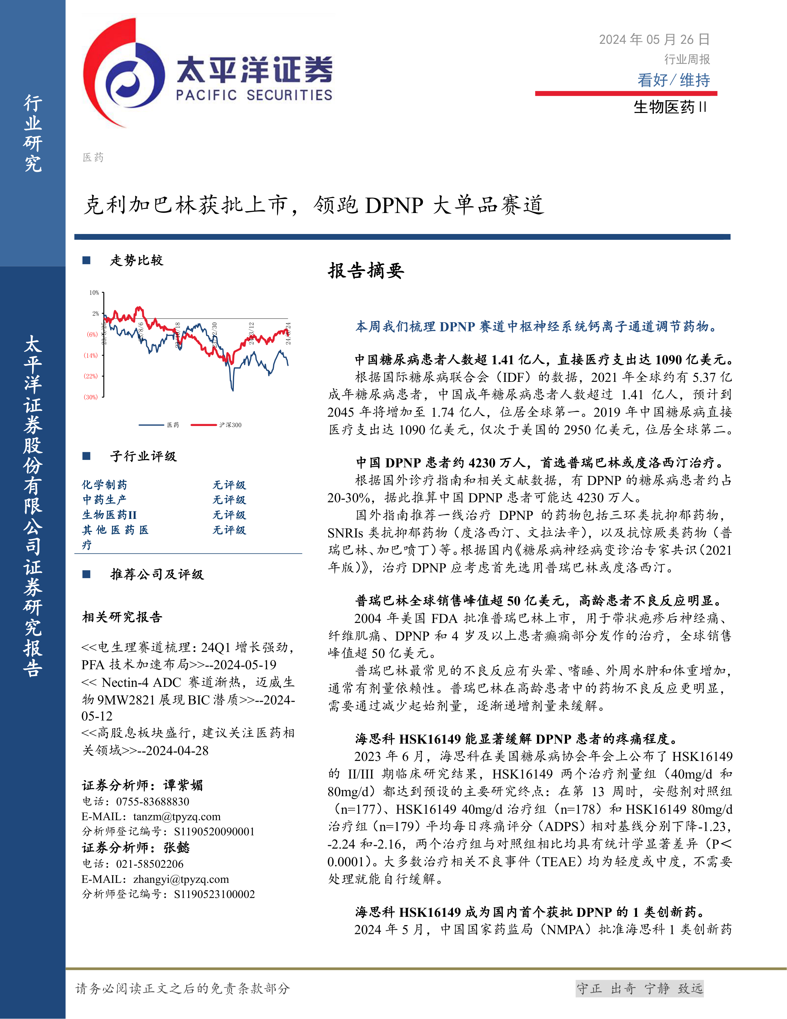 本报告重点关注克利加巴林(HSK16149)的获批上市,认为其有望成为DPNP治疗领域的重磅大单品,并分析了其成功的关键因素,包括巨大的市场需求和自身优越的疗效及安全性。 报告同时对中国DPNP市场现状、现有治疗方案的局限性以及医药行业整体市场走势进行了分析,并提出了相应的投资建议。 需要注意的是,报告中的投资建议仅供参考,不构成投资建议,投资者需自行承担投资风险。 报告数据主要来源于Wind数据、国际糖尿病联合会(IDF)的数据以及国内外诊疗指南和相关文献。