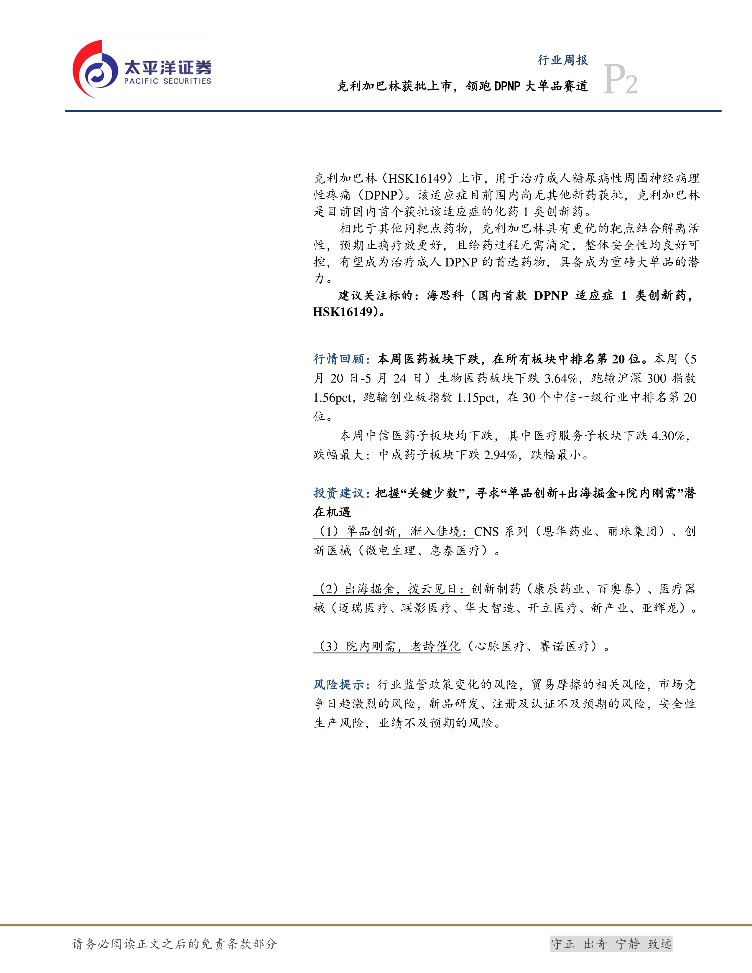 本报告的核心观点是:克利加巴林(HSK16149)的获批上市,标志着国内DPNP(糖尿病性周围神经病理性疼痛)治疗领域取得重大突破,该药有望成为该领域的重磅大单品。同时,报告分析了中国DPNP庞大的市场空间、现有治疗药物的局限性以及克利加巴林的优势,并对医药行业整体市场走势及投资建议进行了探讨。