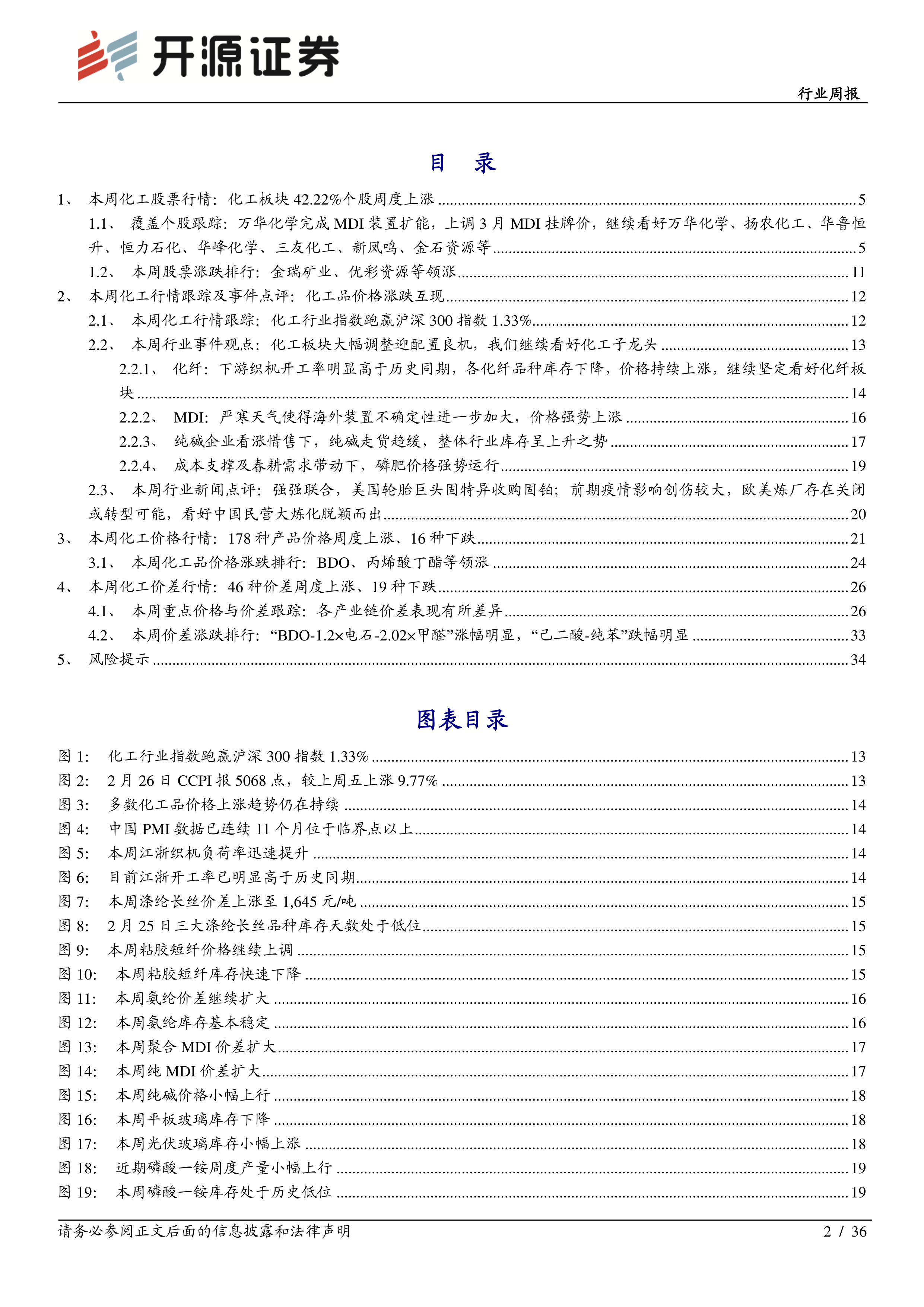 本周(2月22日-2月26日)化工板块大幅调整迎配置良机,我们继续看好化工子龙头。近期原油价格拉涨对化工品起到成本支撑作用。节后国内商品期货普遍上涨,能化品如原油、乙二醇、塑料等表现强势。站在当前时点,尽管本周化工板块出现较大幅度调整,但多数化工品仍在上涨,化工板块估值溢价仍然较低,我们认为板块迎来配置良机。我们建议把握产品需求持续回暖、行业集中度较高且扩产有序(成长性突出)、行业库存偏低的细分化工子行业:聚氨酯、煤化工、大炼化、化纤(涤纶、氨纶、粘胶)、氟化工、农药、维生素行业等。受益标的:【化工龙头白马】万华化学、华鲁恒升、恒力石化、扬农化工、新和成、荣盛石化;【化纤组合】华峰化学、三友化工、新凤鸣;【子行业龙头】金石资源、云图控股、海利得、巨化股份、山东海化、三美股份、利民股份、鲁西化工、滨化股份。
