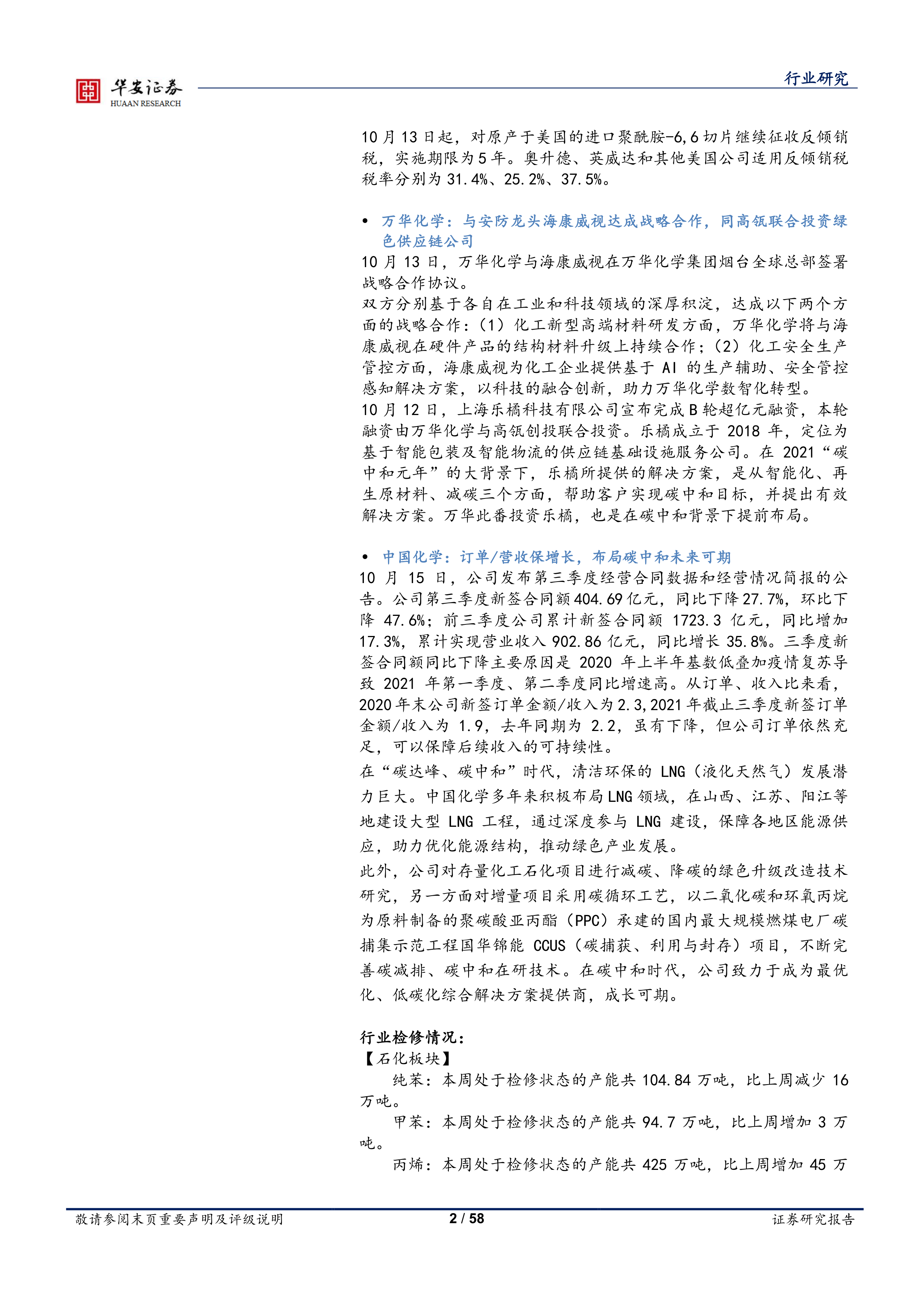 此外,公司对存量化工石化项目进行减碳、降碳的绿色升级改造技术研究,另一方面对增量项目采用碳循环工艺,以二氧化碳和环氧丙烷为原料制备的聚碳酸亚丙酯(PPC)承建的国内最大规模燃煤电厂碳捕集示范工程国华锦能CCUS(碳捕获、利用与封存)项目,不断完善碳减排、碳中和在研技术。在碳中和时代,公司致力于成为最优化、低碳化综合解决方案提供商,成长可期。行业检修情况: