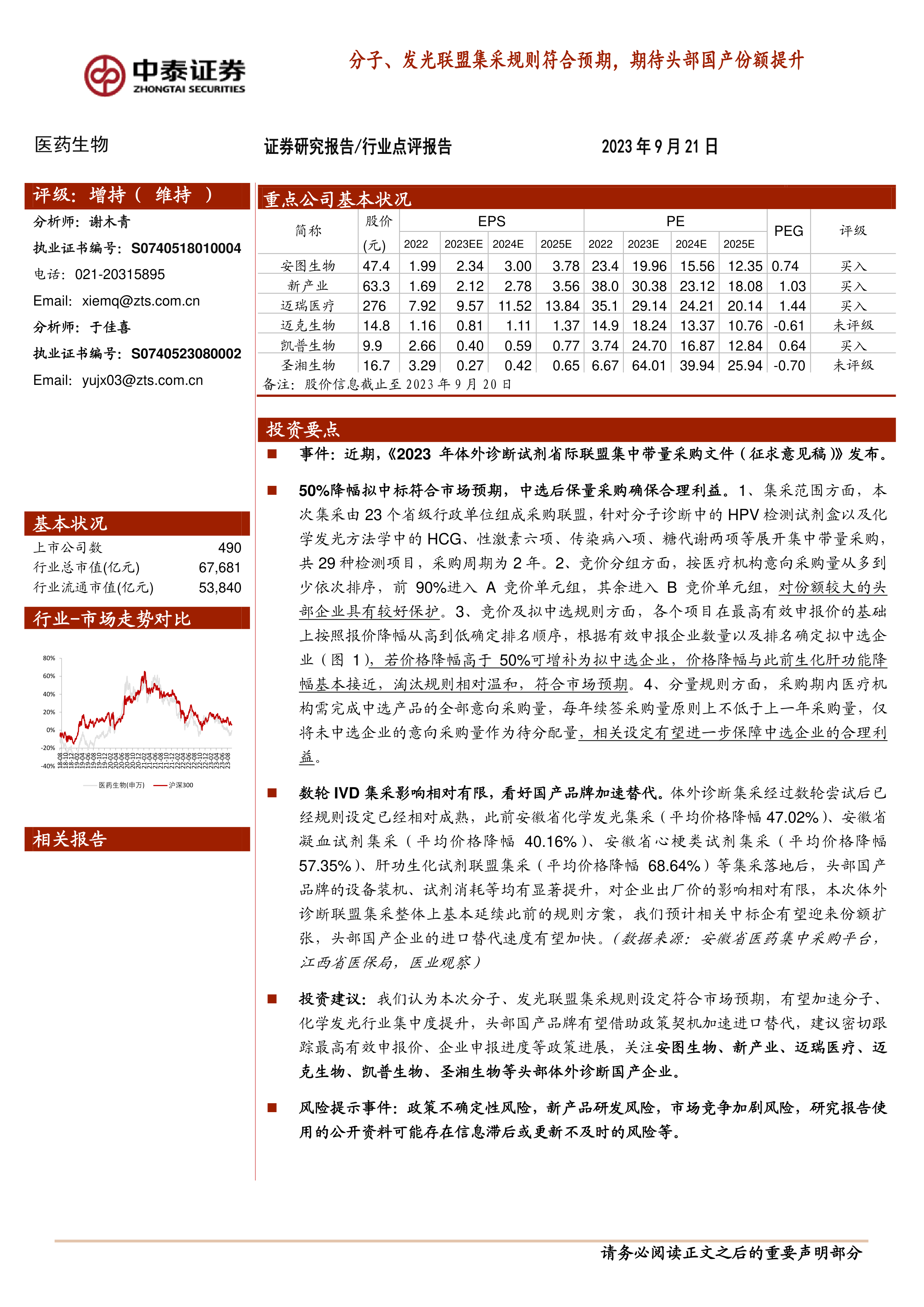 报告对安图生物、新产业、迈瑞医疗、迈克生物、凯普生物、圣湘生物等头部国产体外诊断企业进行了投资建议。 报告基于对集采规则的分析以及此前集采经验的总结,认为这些企业有望受益于本次集采,并建议投资者密切关注相关政策进展,例如最高有效申报价和企业申报进度等信息。 报告同时提供了这些企业的股价、EPS、PE、PEG等关键财务指标数据,为投资决策提供参考。 报告中给出的投资评级(买入、增持等)也基于对未来市场走势的预测。