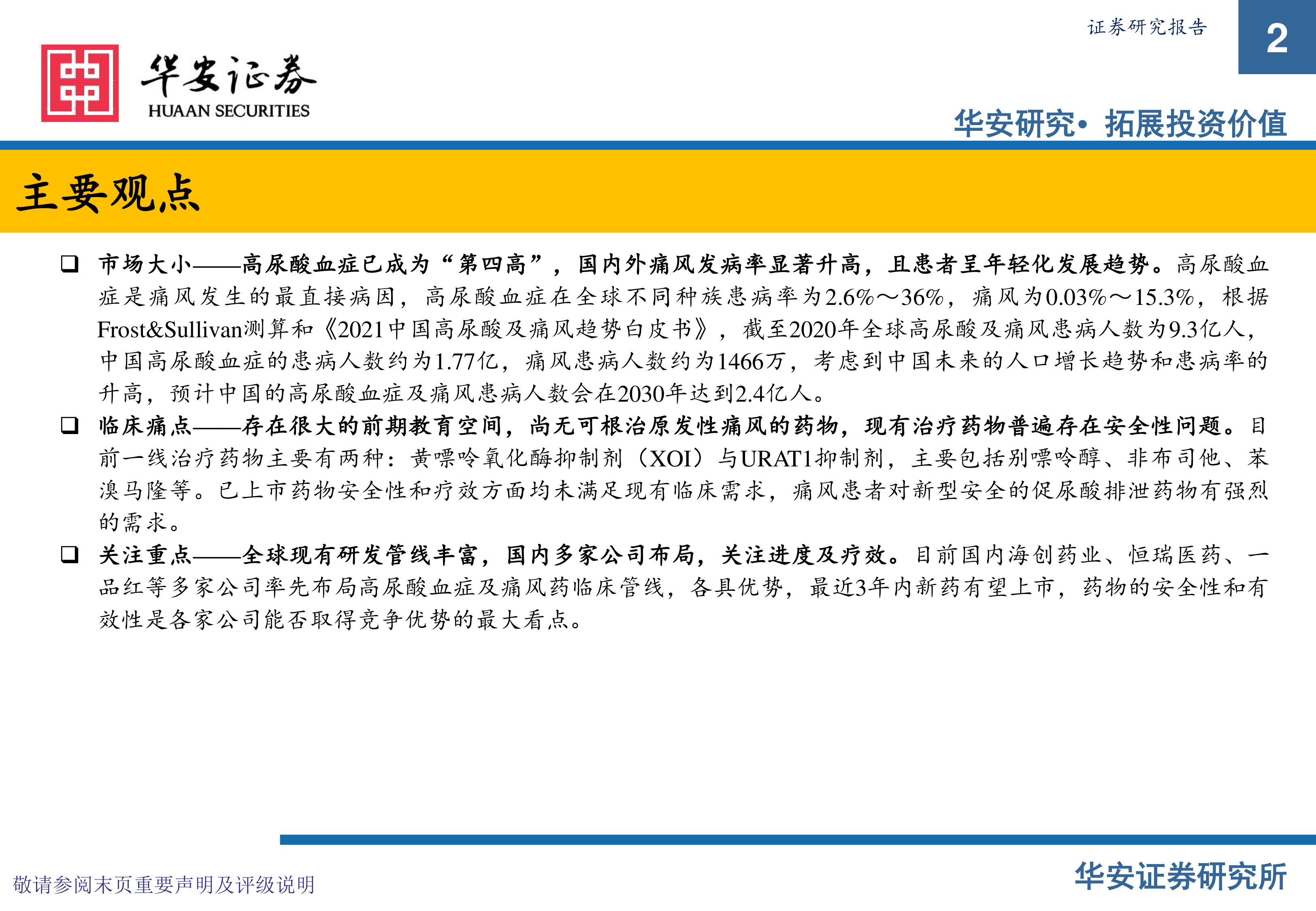 本报告主要从痛风疾病现状及市场容量、痛风药物发展及研发趋势、痛风创新药相关公司梳理三个方面展开分析。